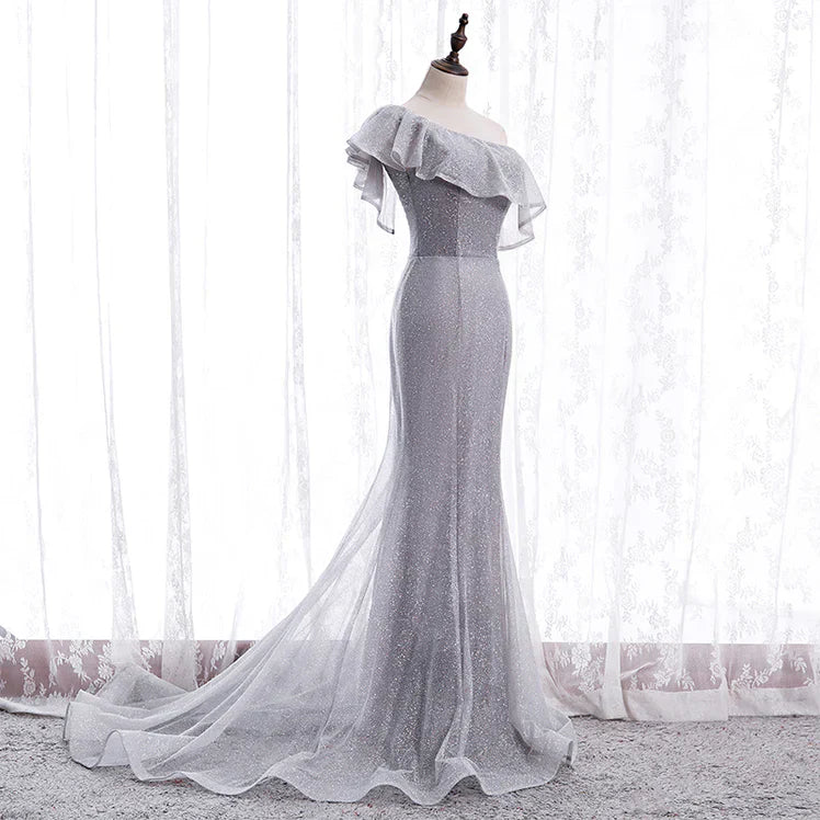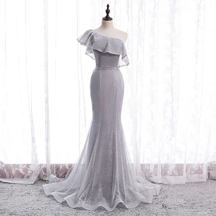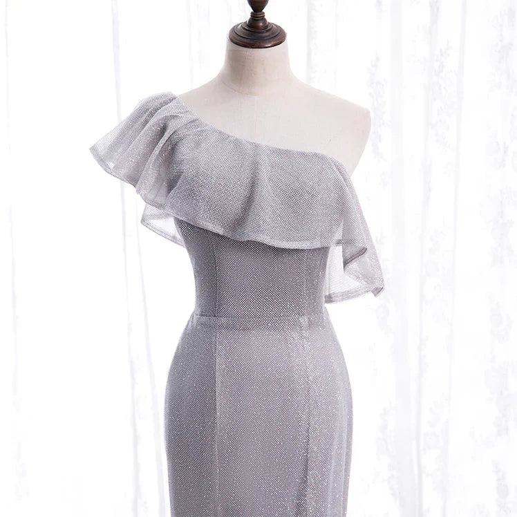 Grey One Shoulder Lace-up Shiny Long Prom Dress Party Dress Long Evening Dress Floor Length