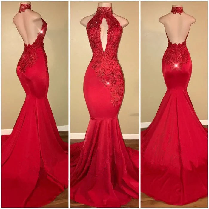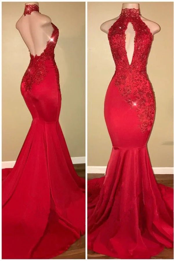 Halter Backless Sexy Prom Dresses with Lace Appliques Mermaid Sleeveless Evening Gown,SSR1118