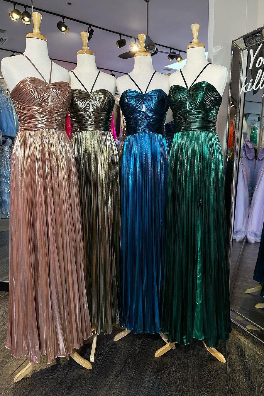 Halter Blue Metallic Pleated A-line Long Formal Dress