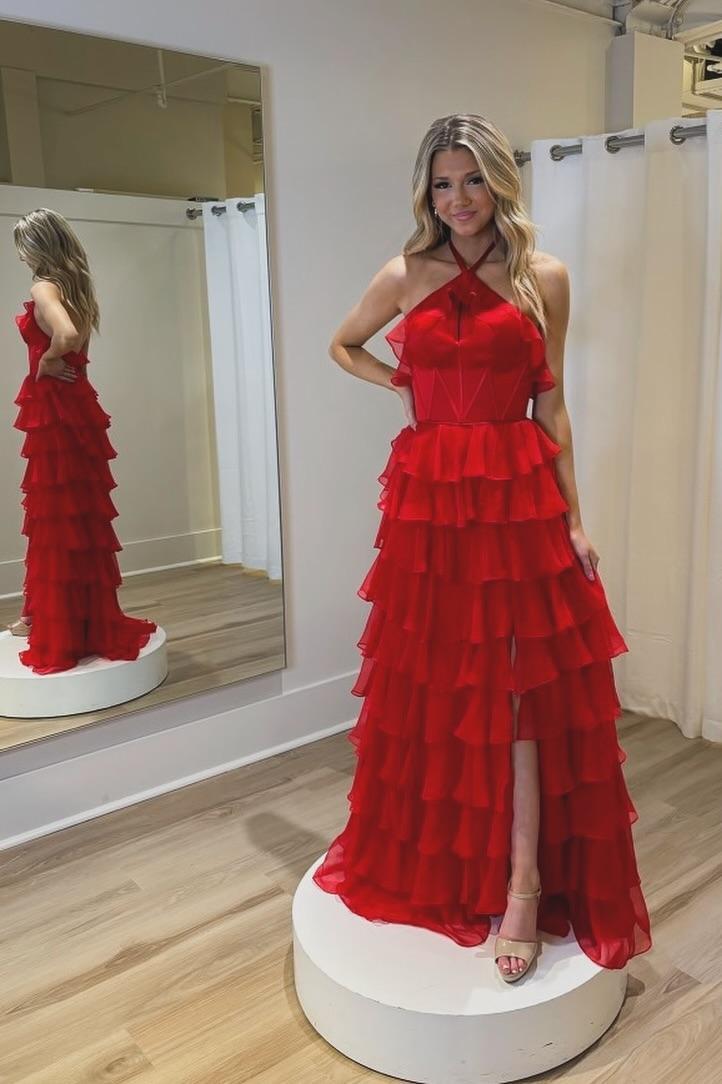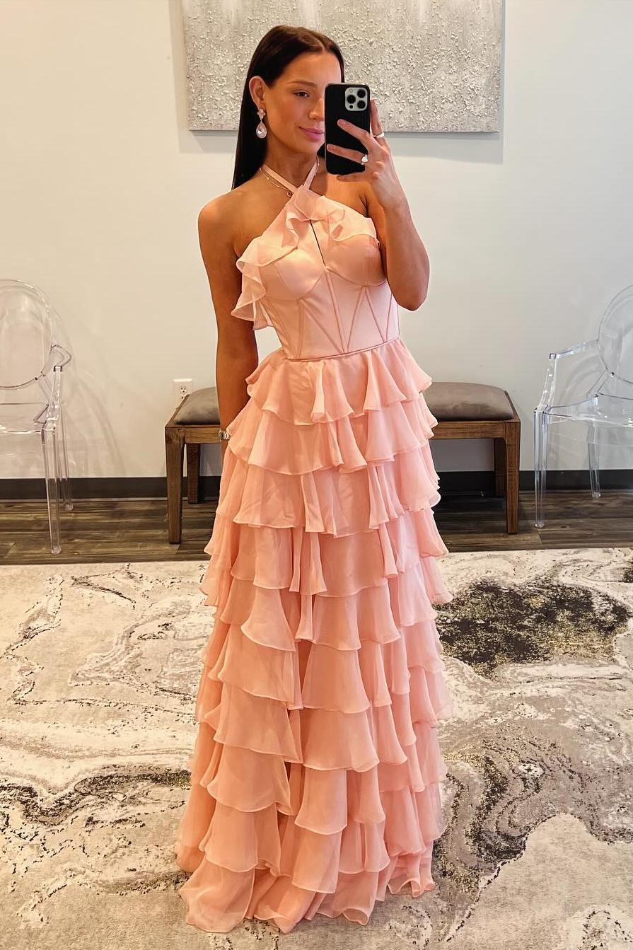 Halter Fuchsia Ruffle A-line Long Formal Dress