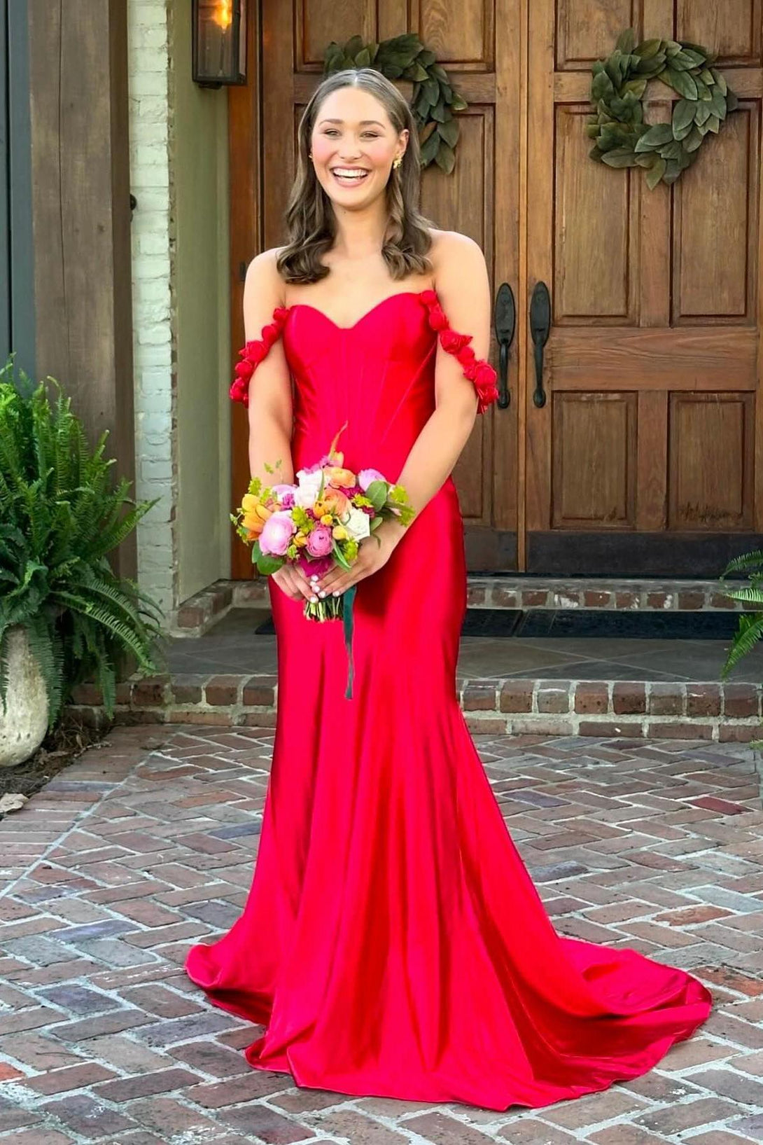 Handmade Flowers Straps Hot Pink Satin Mermaid Prom Dress