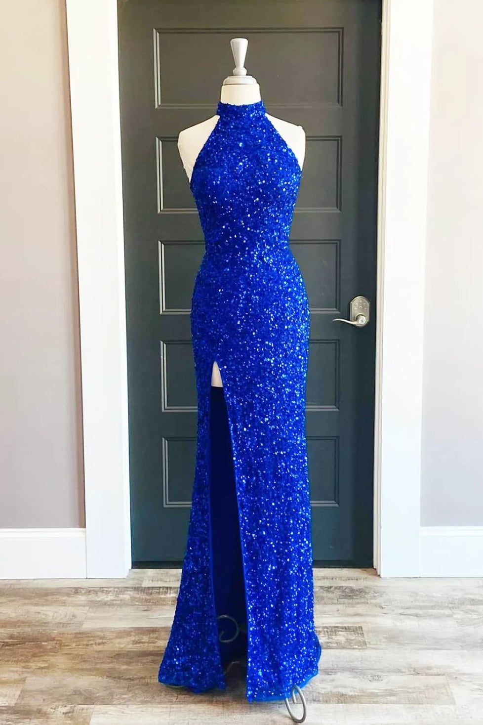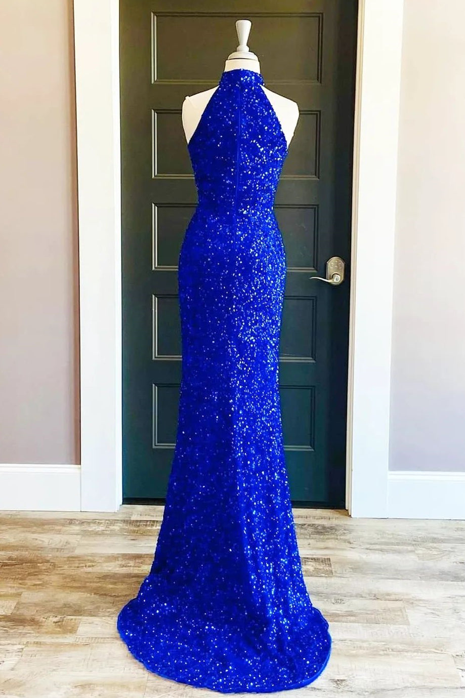High Neck Baby Blue Sequin Mermaid Long Formal Dress