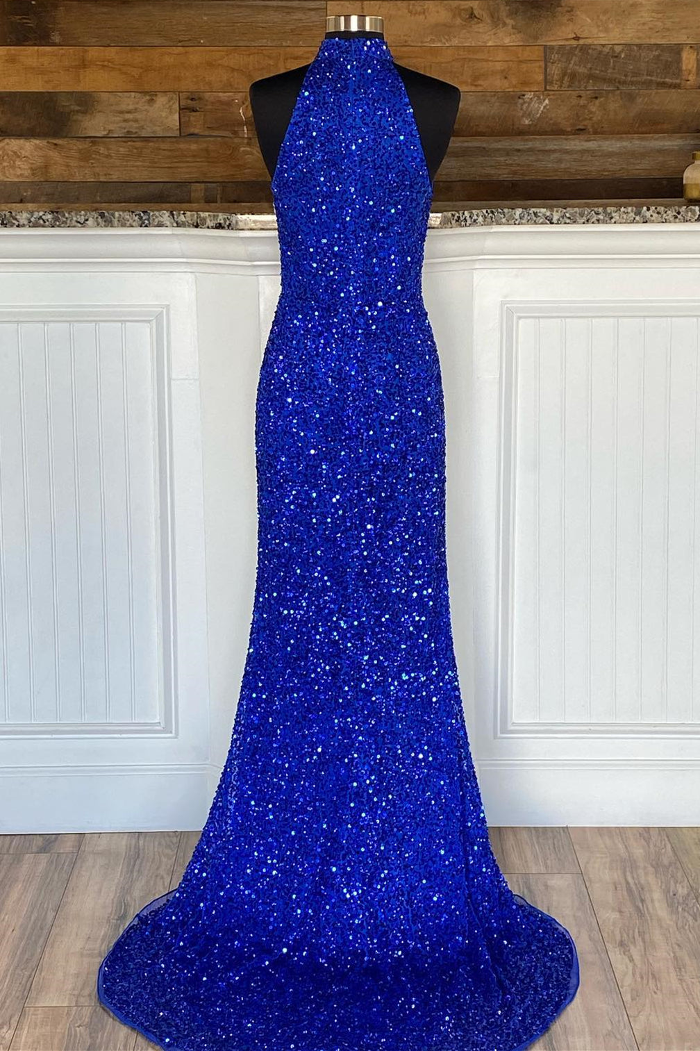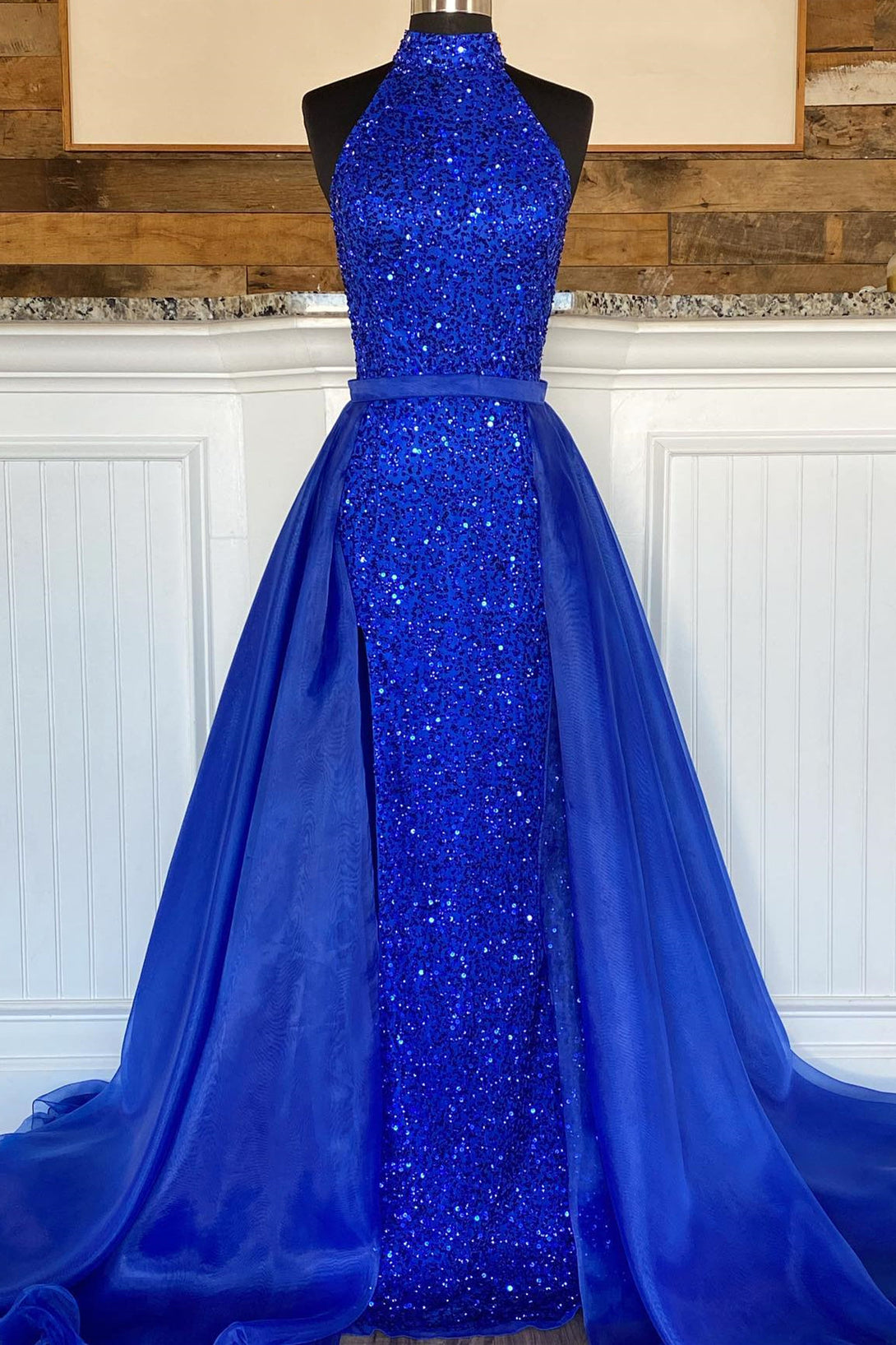 High Neck Royal Blue Sequin Mermaid Long Formal Dress with Detachable Train