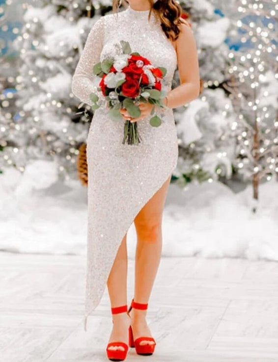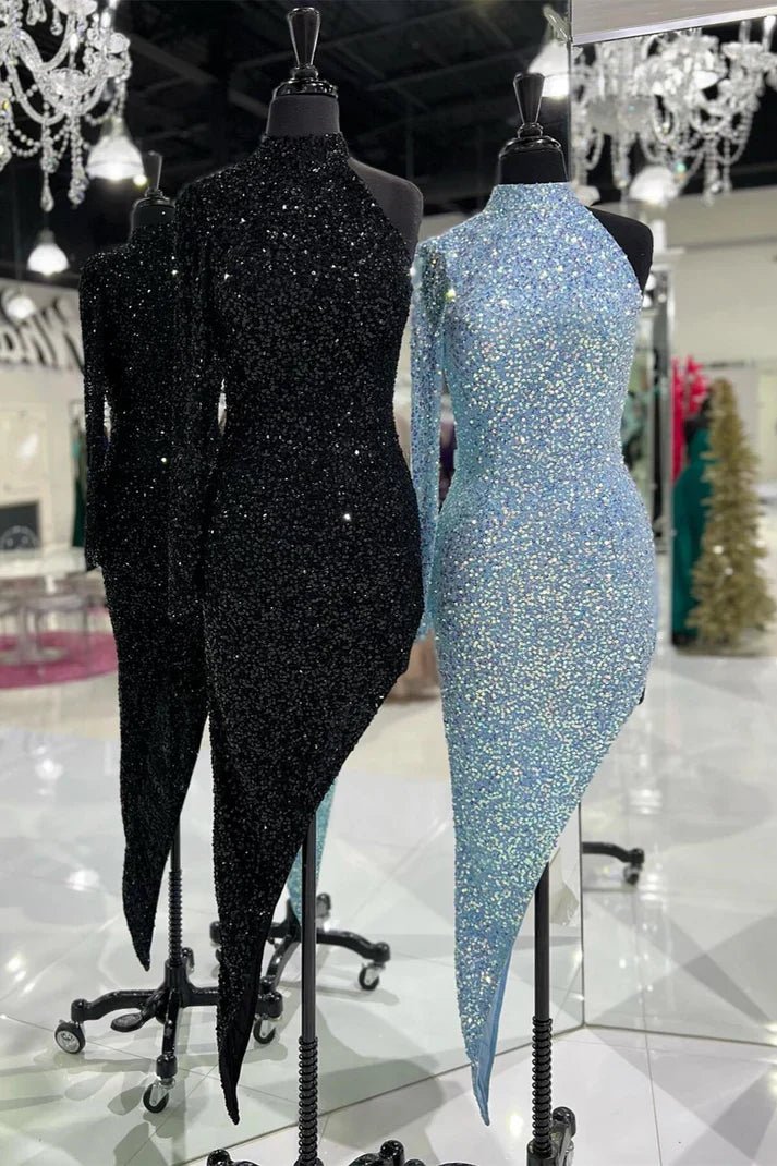 High Neck Tight Sequins Long Dress One Shoulder Sparkly Party Dress Charming