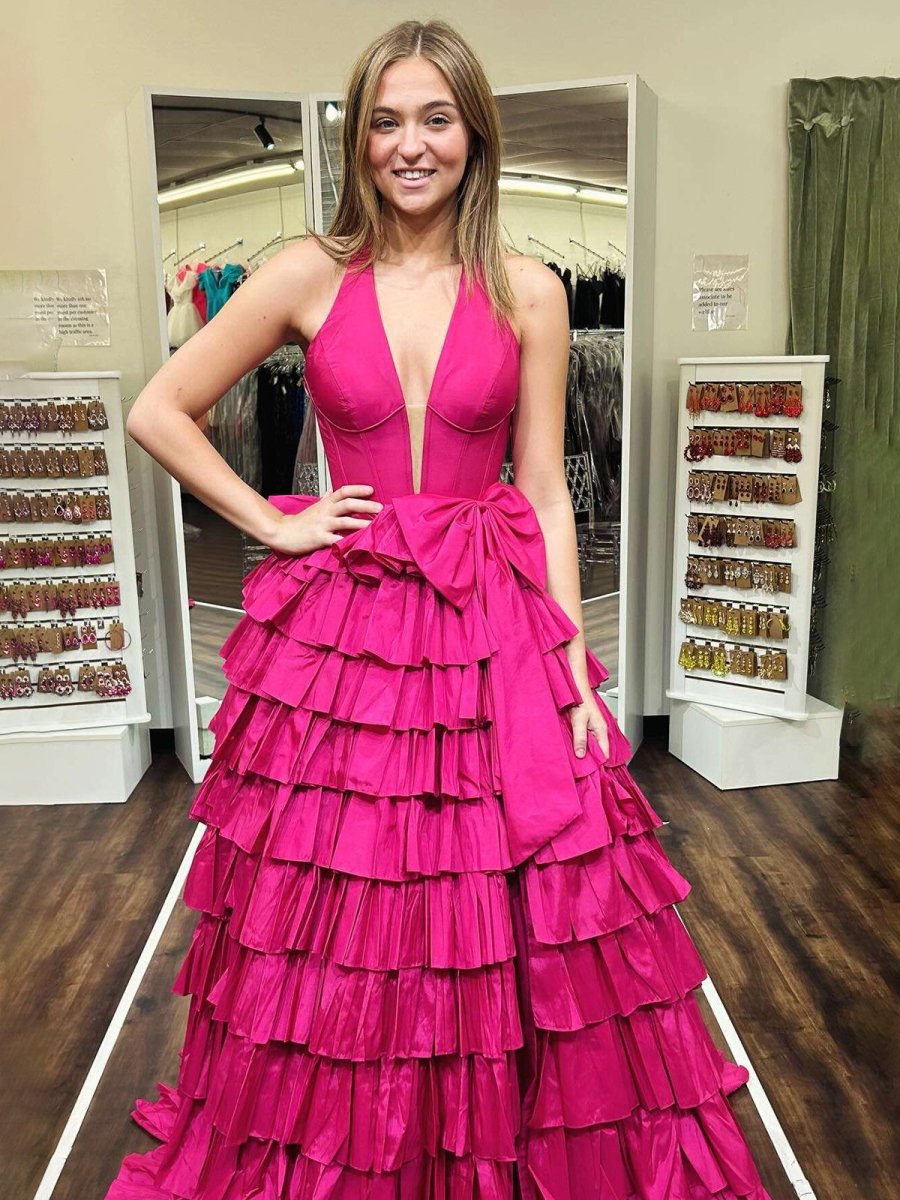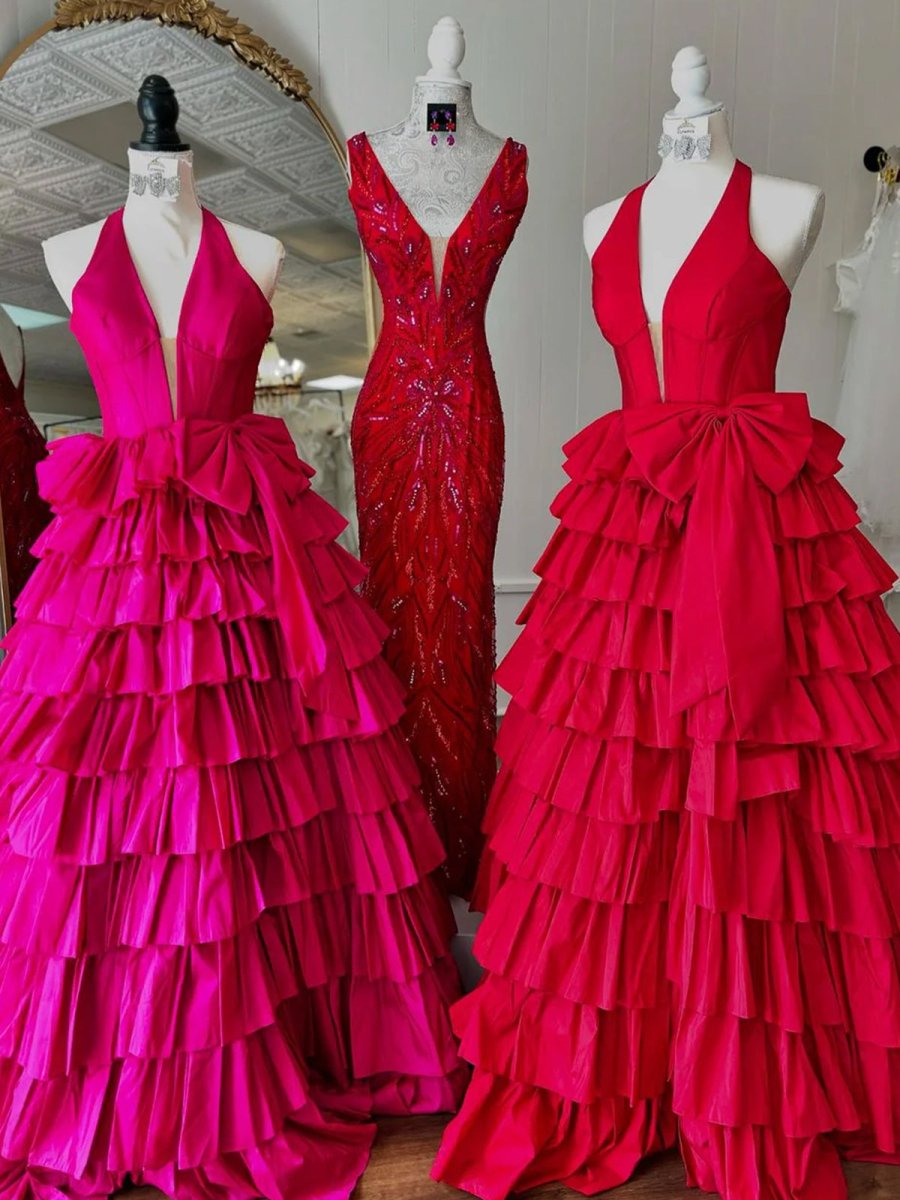 Iridium | Halter A-Line Blue Satin Long Ruffled Prom Dress With Slit