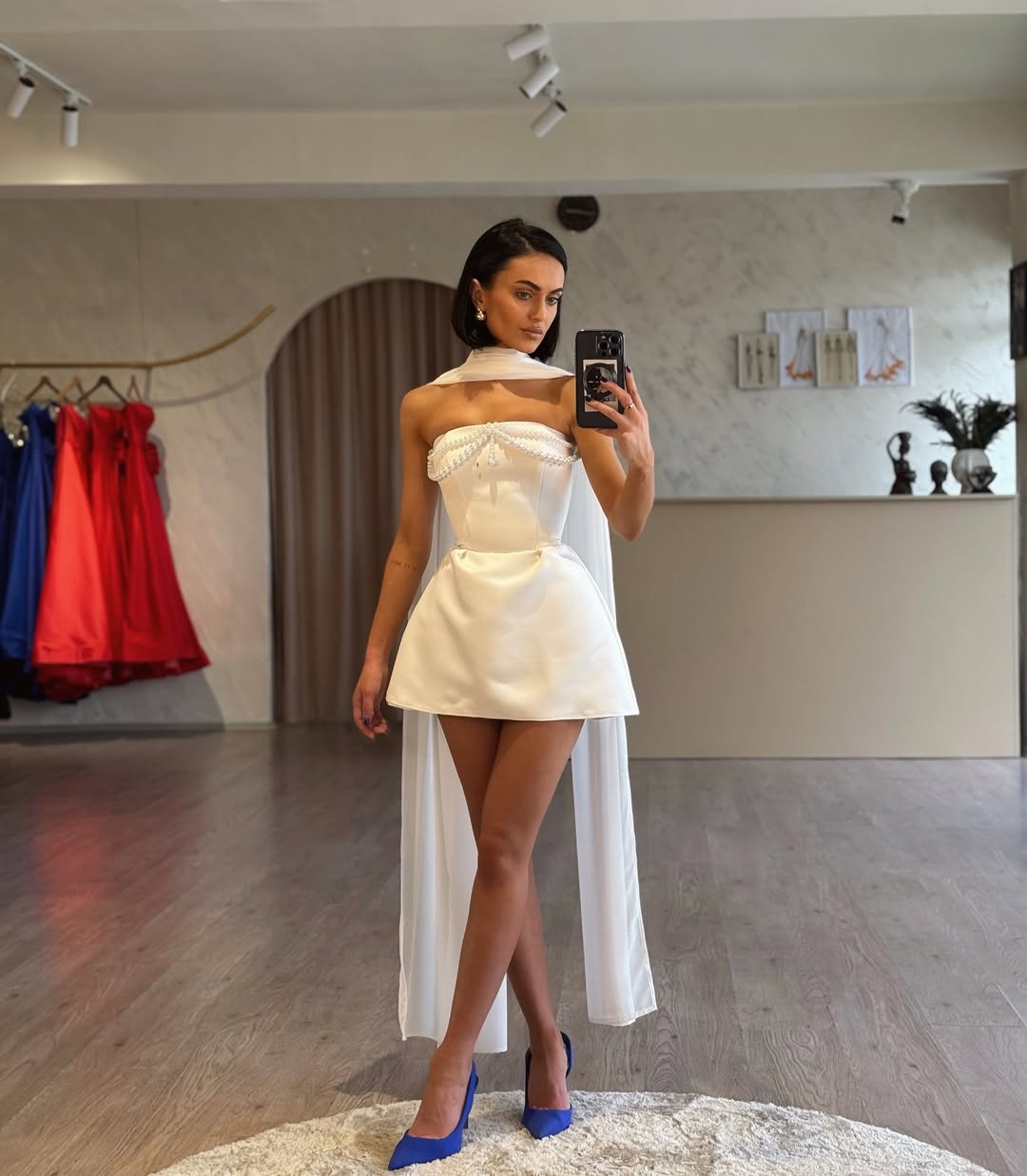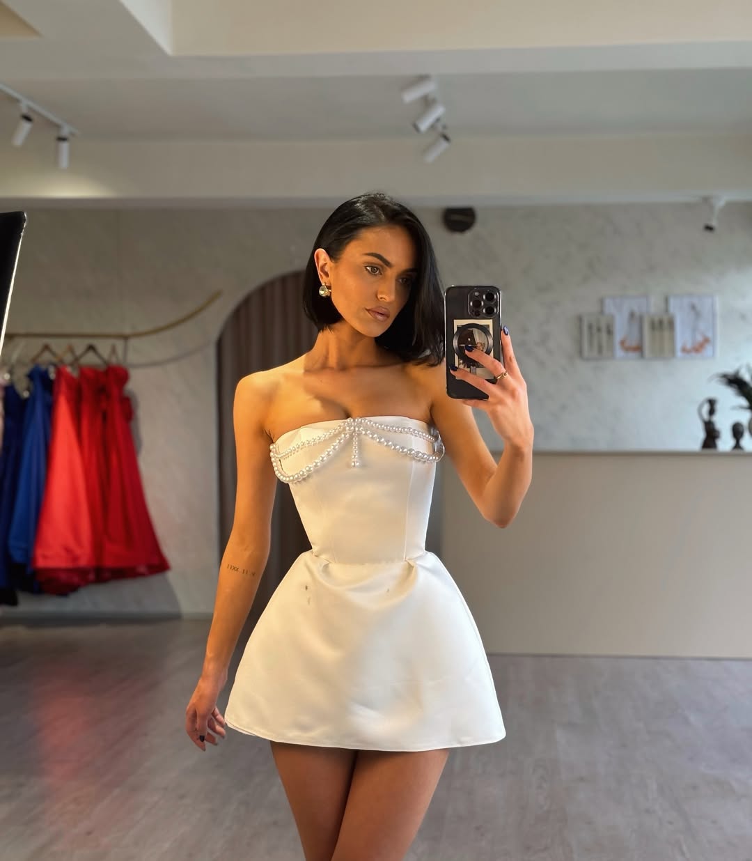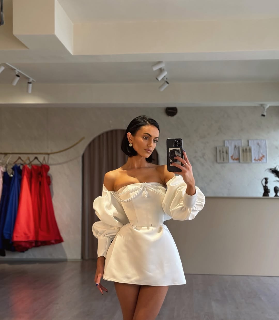 Ivory Strapless Pearls Short Mini Puff Sleeves Prom Dress ssr0684