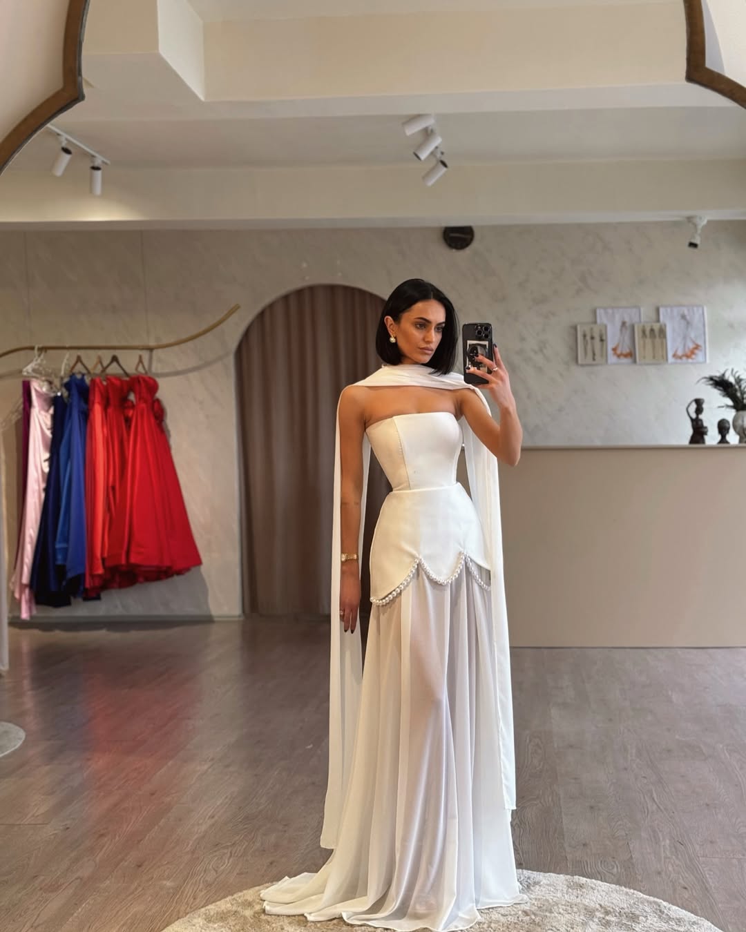 Ivory Strapless Pearls Spliced Prom Dress ssr0685