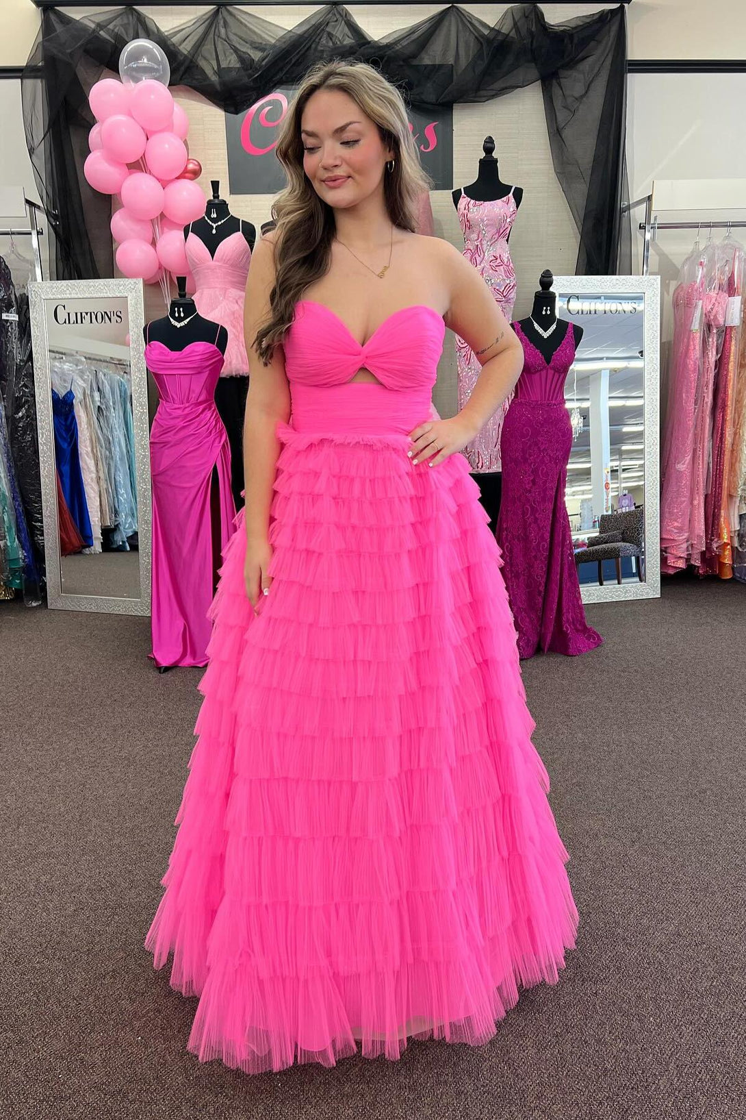 Knotted Hot Pink Tulle Tiered A-line Long Dress
