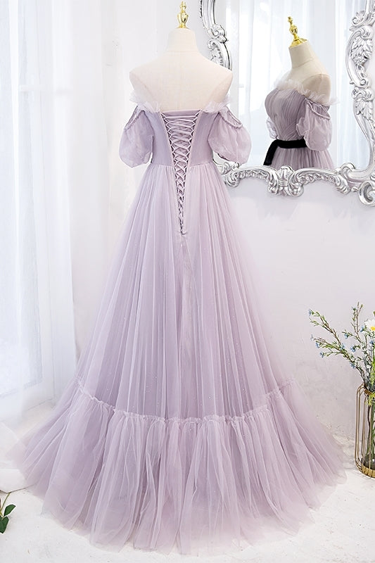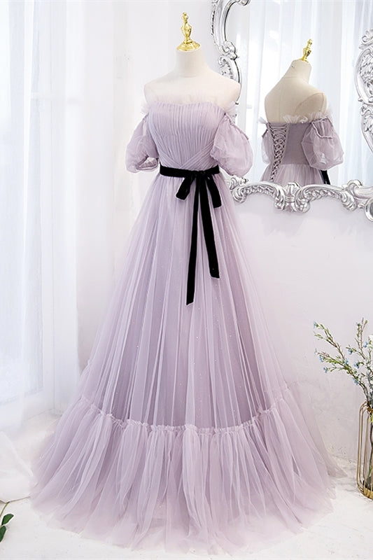 Lavender Soft Tulle Off the Shoulder Long Prom Dress