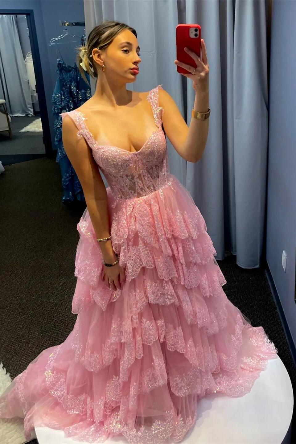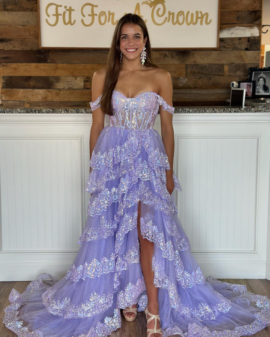 Light Blue Sequin Appliques Tiered Ruffles Prom Gown