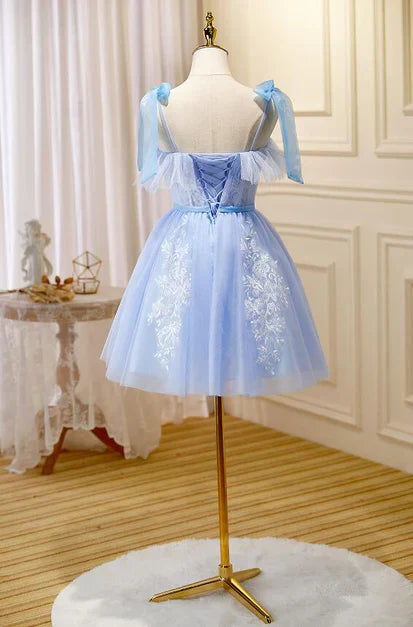 Light Blue Tulle with Lace Party Dress Homecoming Dresses Short Formal Dress With Bow(s)