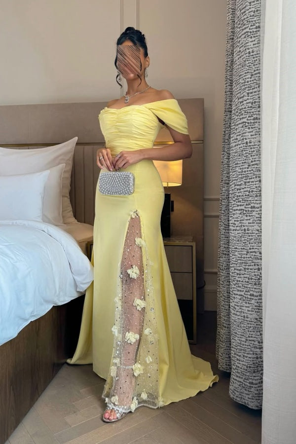 Light Yellow Split Off-The-Shoulder Prom Dress ssr0315