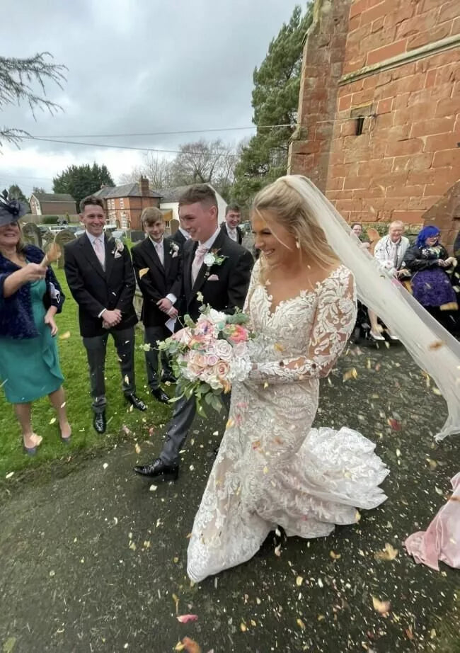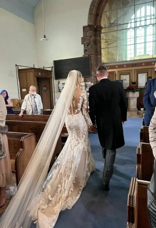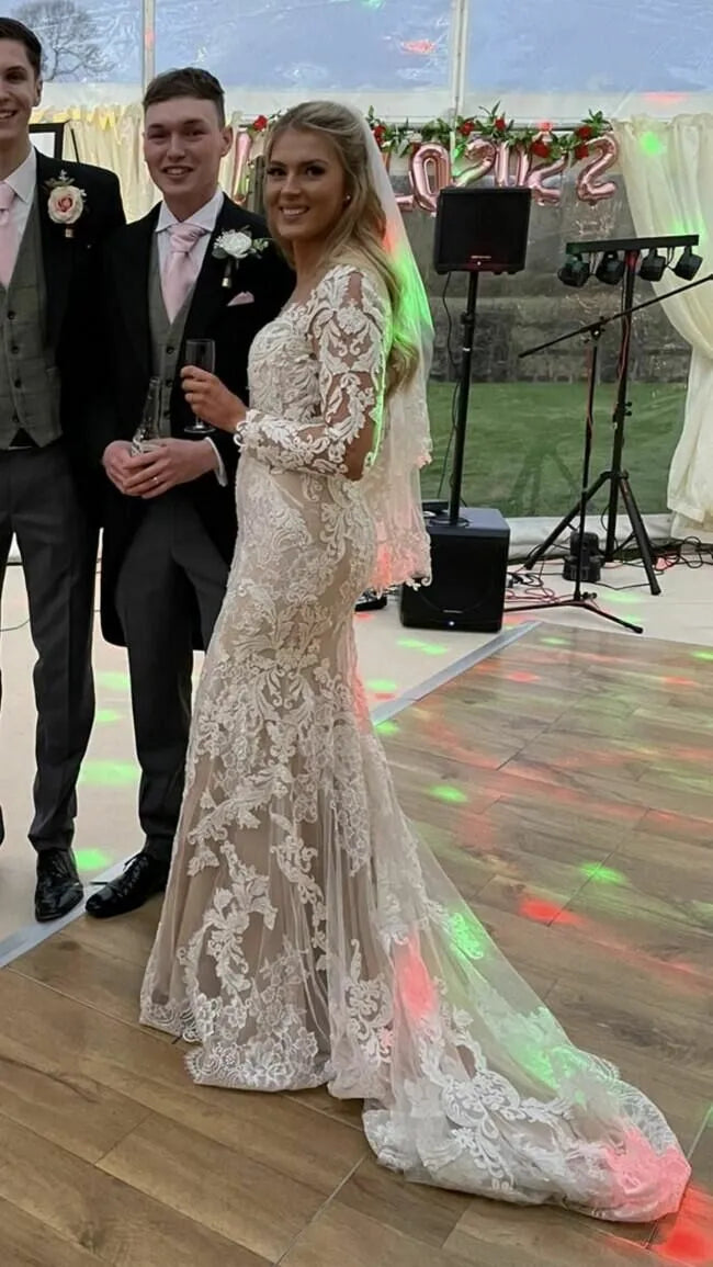 Long Sleeves Champagne Mermaid Wedding Dresses Lace Illusion Neck Bridal Dress