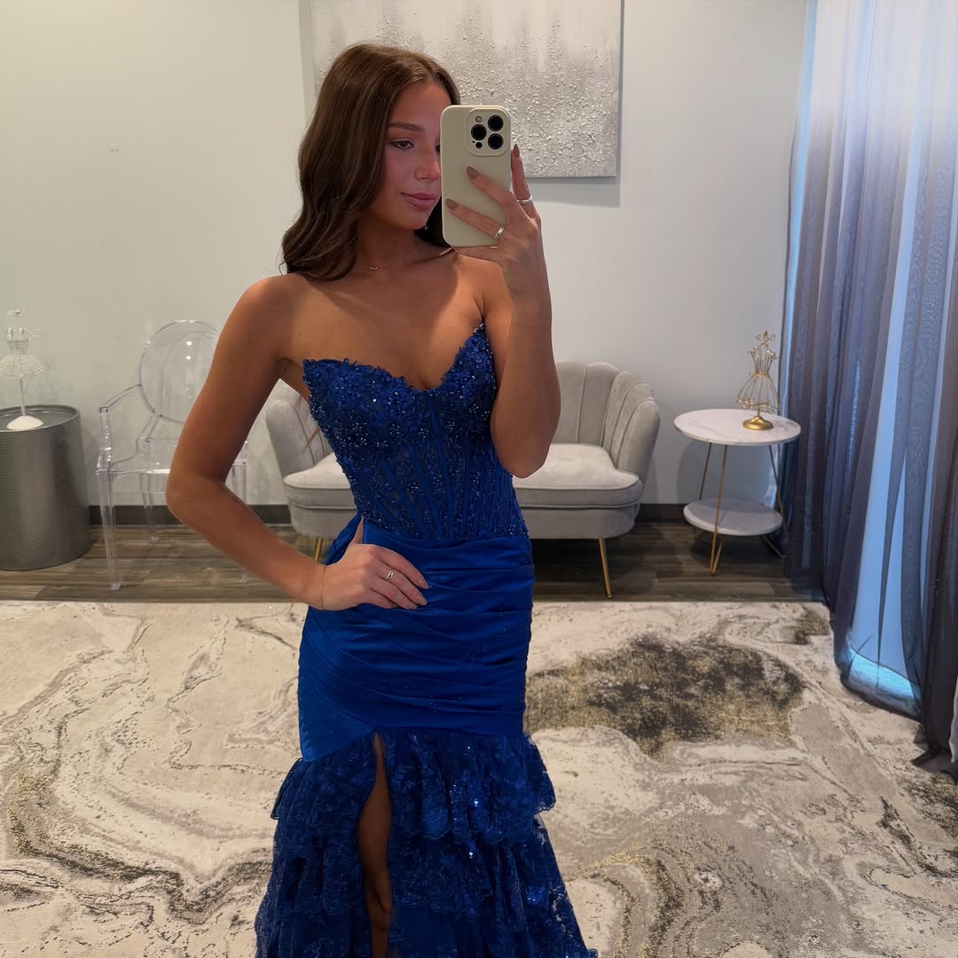Lovely Royal Blue Split Appliques Ruffles Prom Dress ssr0658