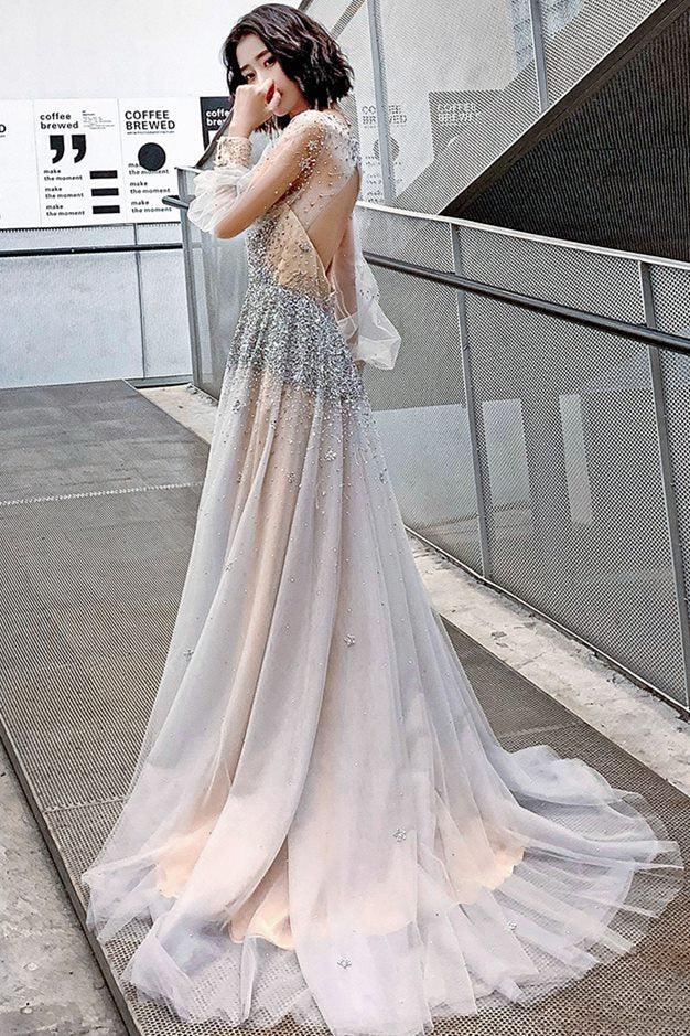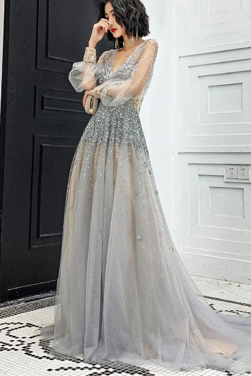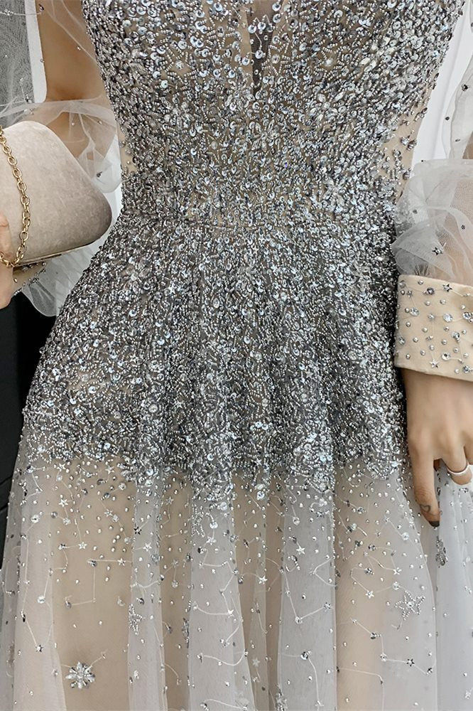 Luxurious Long Sleeves Silver Sequins Long Evening Dress