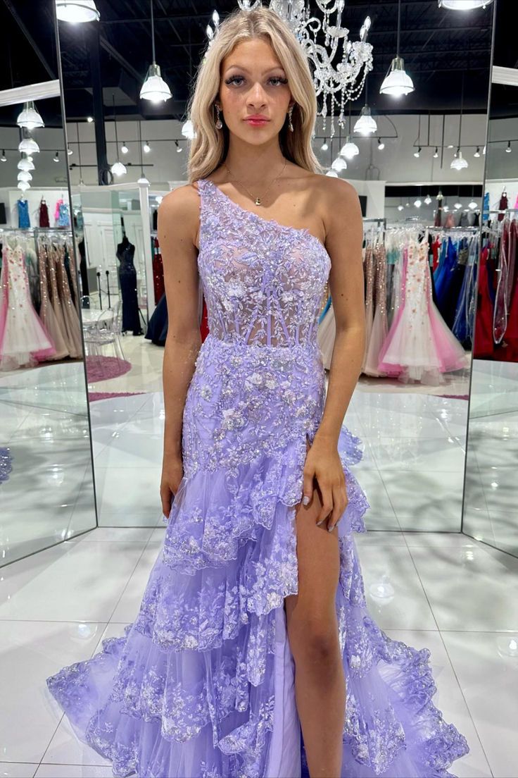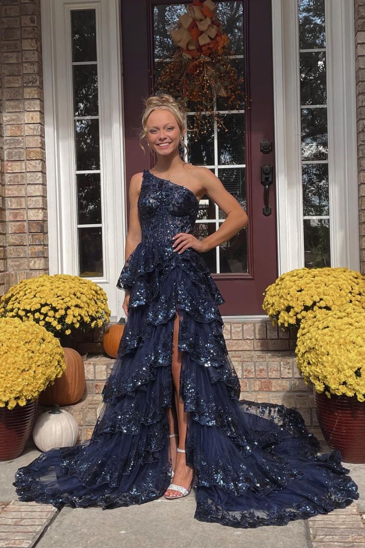 Luxury Lace One Shoulder Sequined Appliques Multi Layers Split Prom Dress