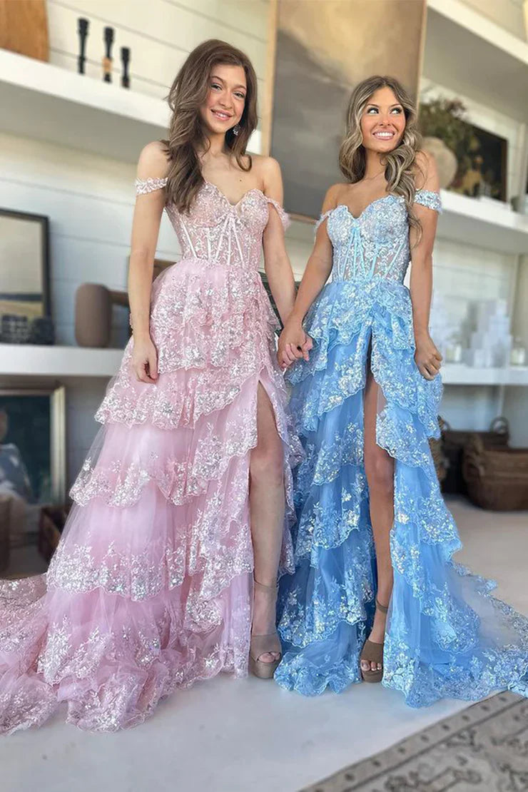 Luxury Off The Shoulder Lace Sequin Ruffle Prom Dresses