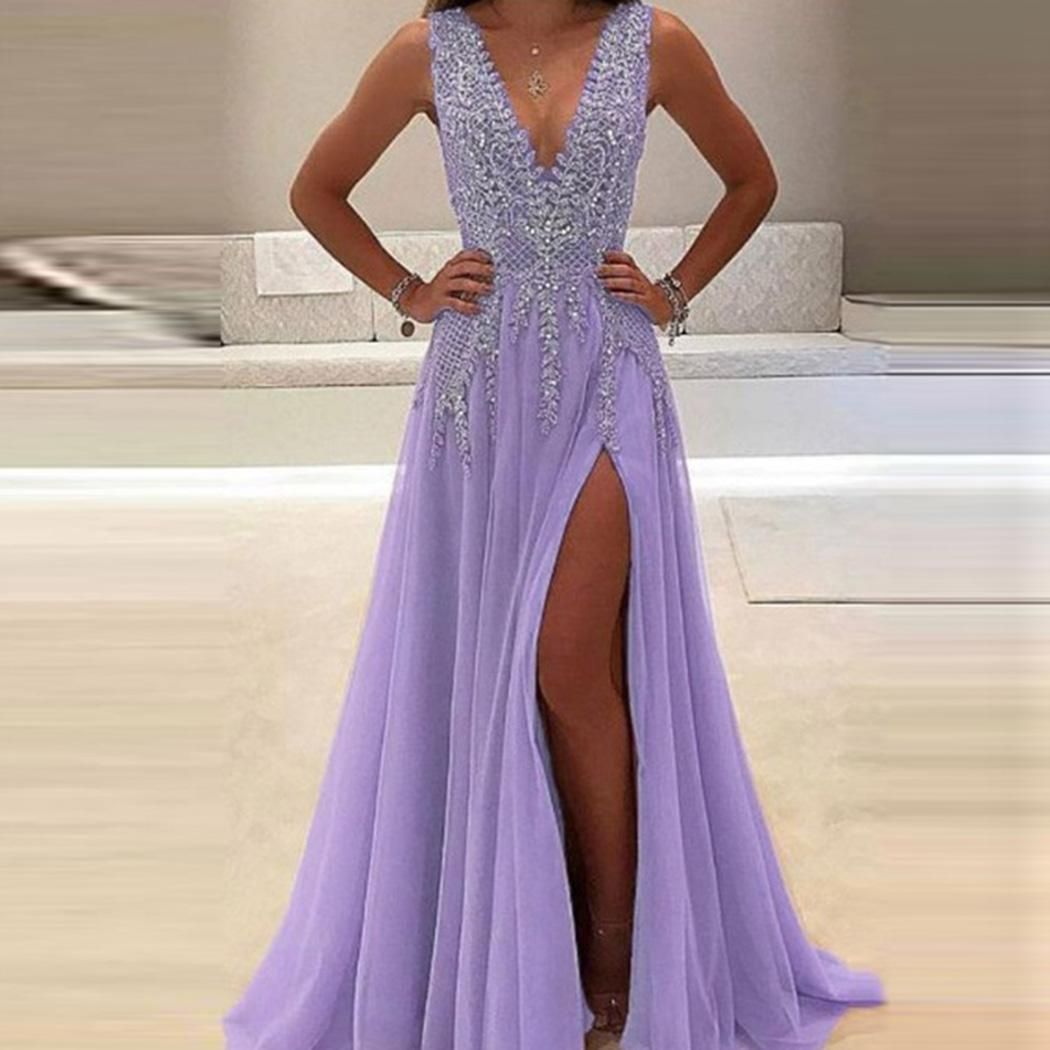 Luxury Purple Beaded V-Neck Long Prom Dress
