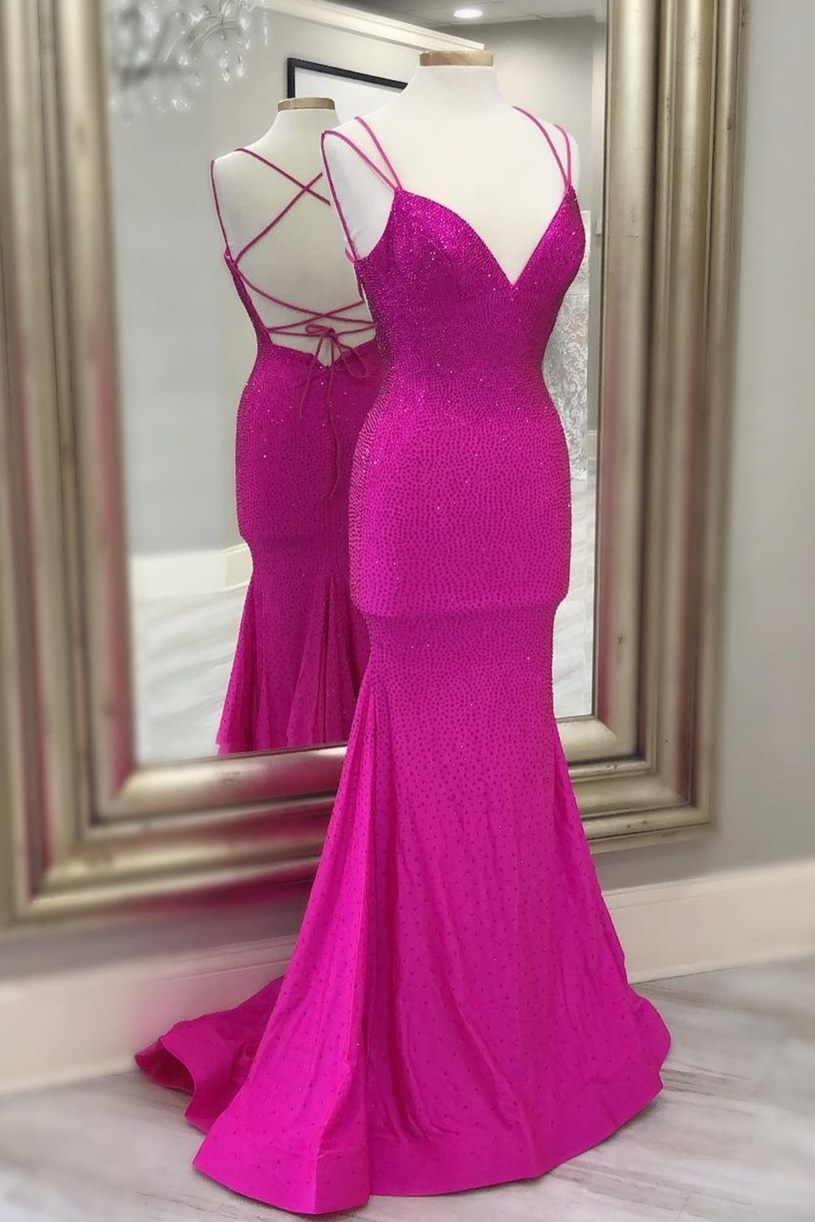 Mermaid Hot Pink Beaded Long Prom Gown