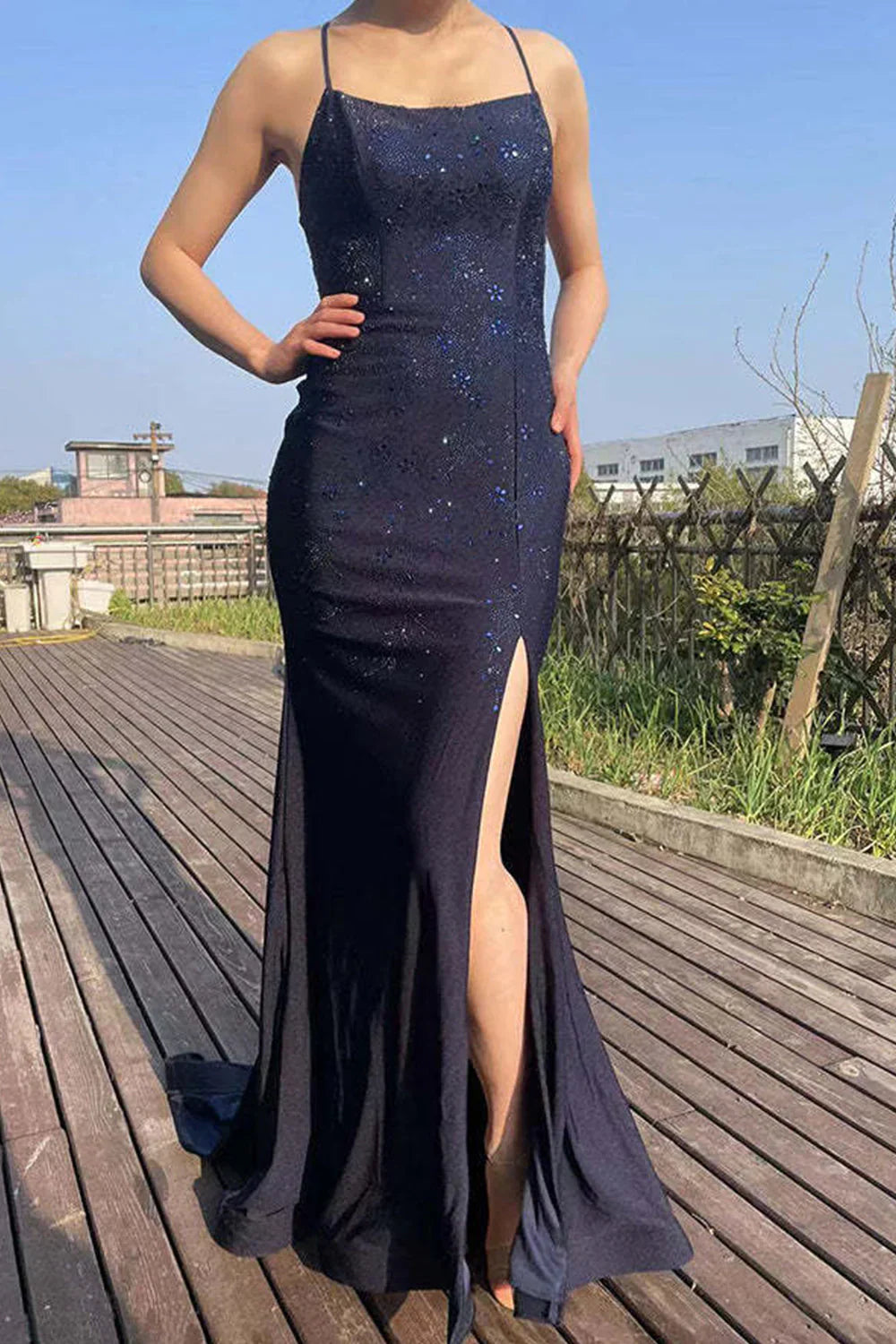 Navy Spaghetti Straps Backless Beaded Mermaid Prom Dress With Split Elegant Evening Dress