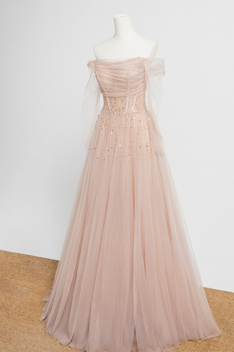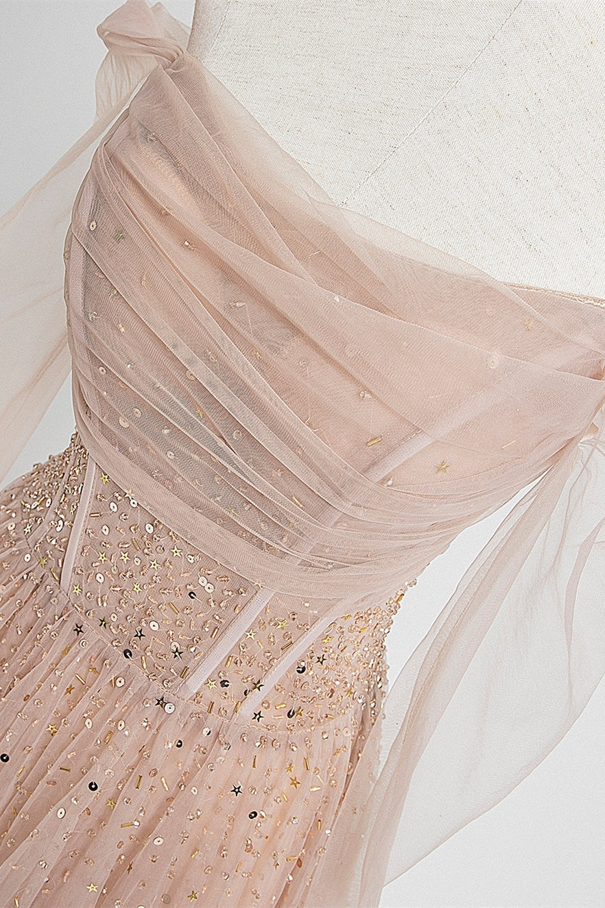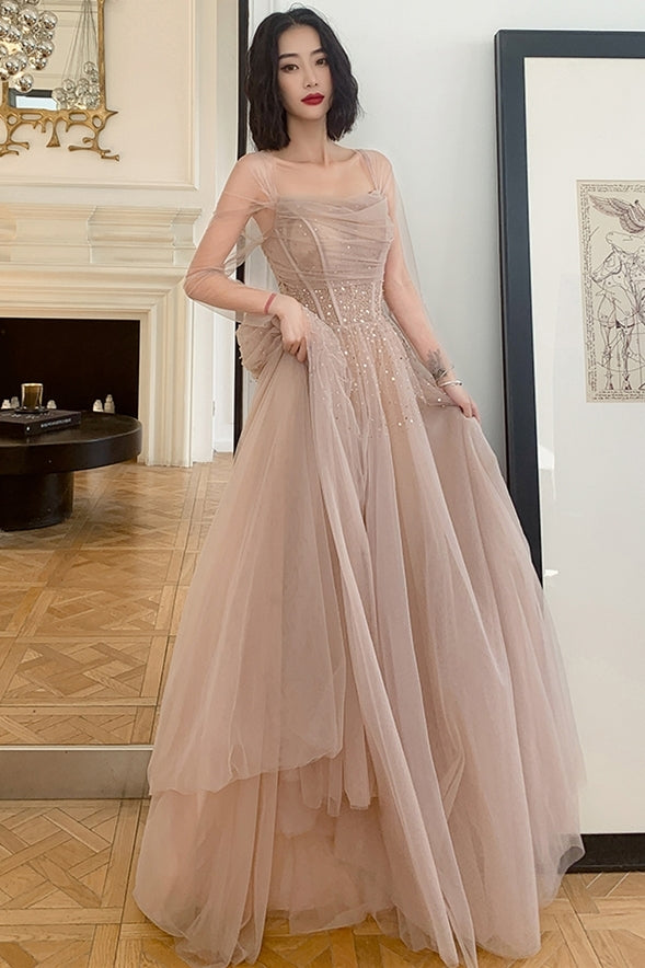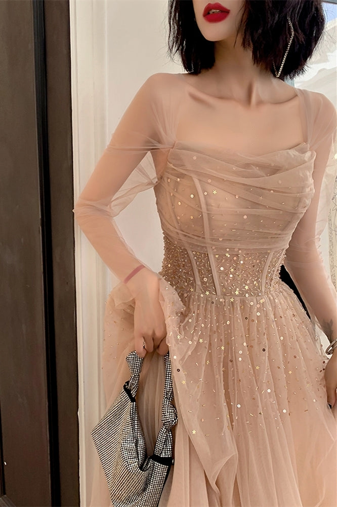 Nude Long Sleeves Tulle and Sequins Long Prom Dress