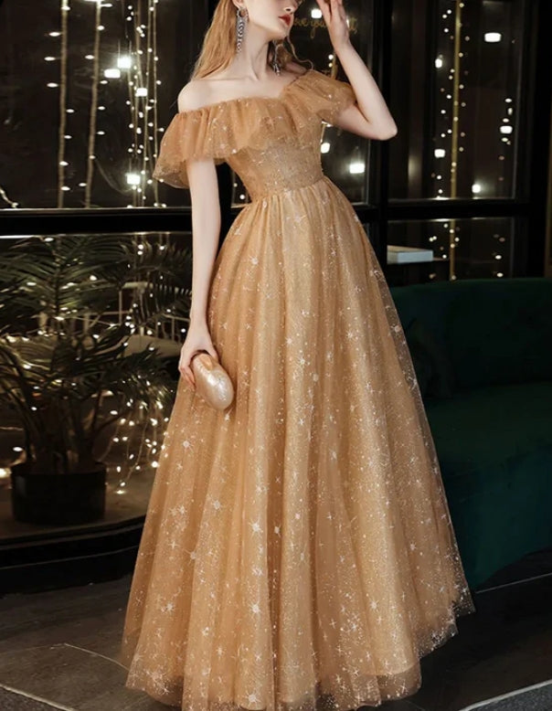 Off Shoulder Champagne Tulle Long Party Dress A-line Lace-up Evening Gown Prom Dress