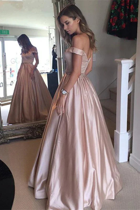 Off The Shoulder Pink A-Line Satin Prom Party Dress