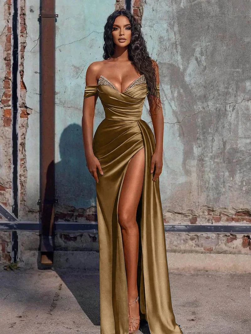 Off The Shoulder Beaded Satin Long Prom Dresses