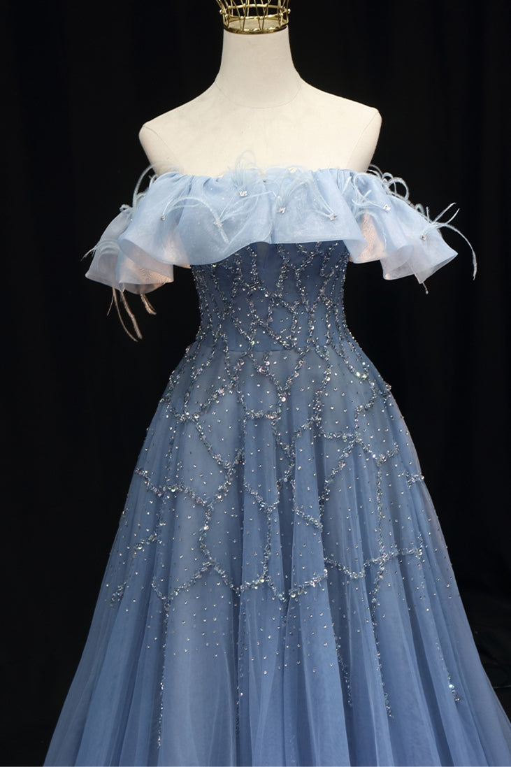 Off the Shoulder Blue Beaded A-line Long Formal Dress
