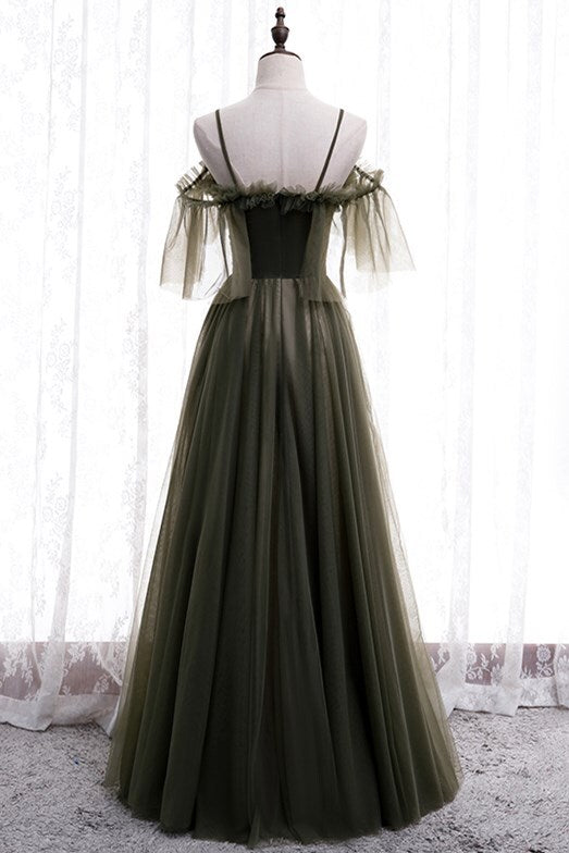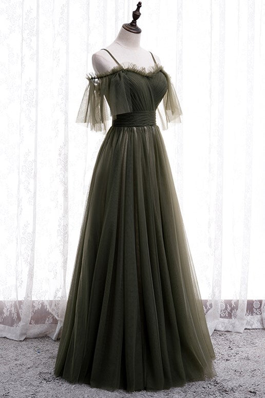 Off the Shoulder Dark Green Pleated Long Formal Dress