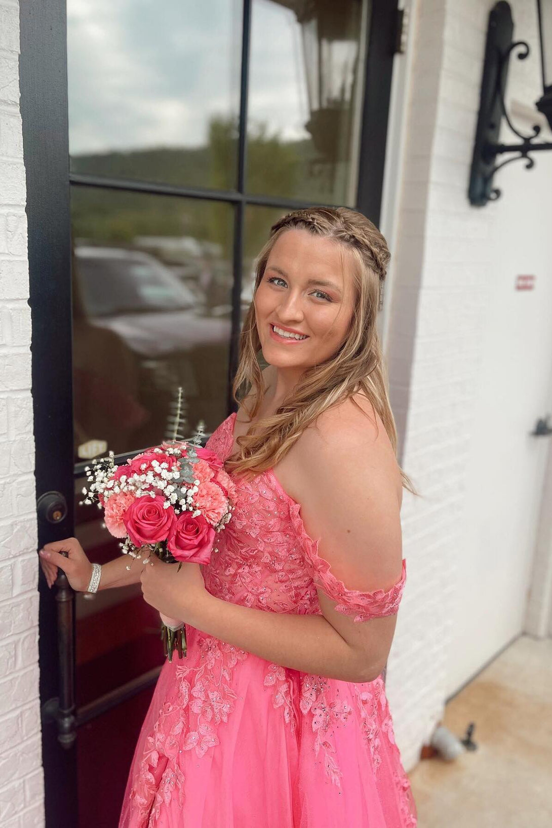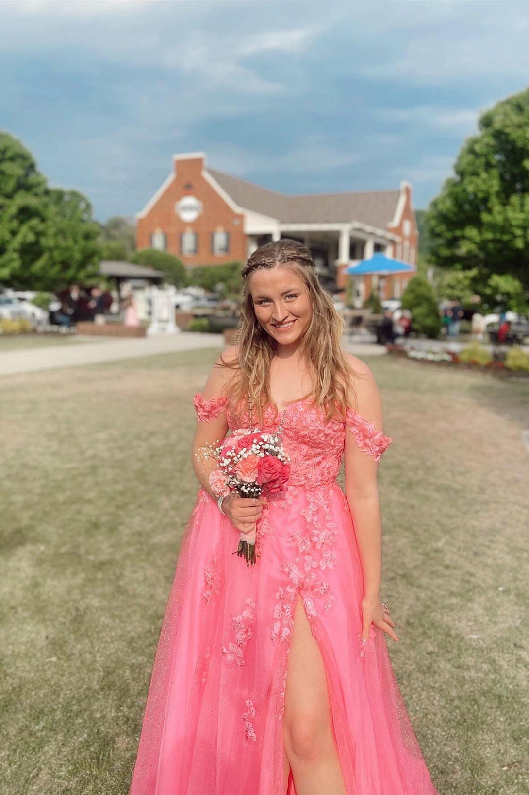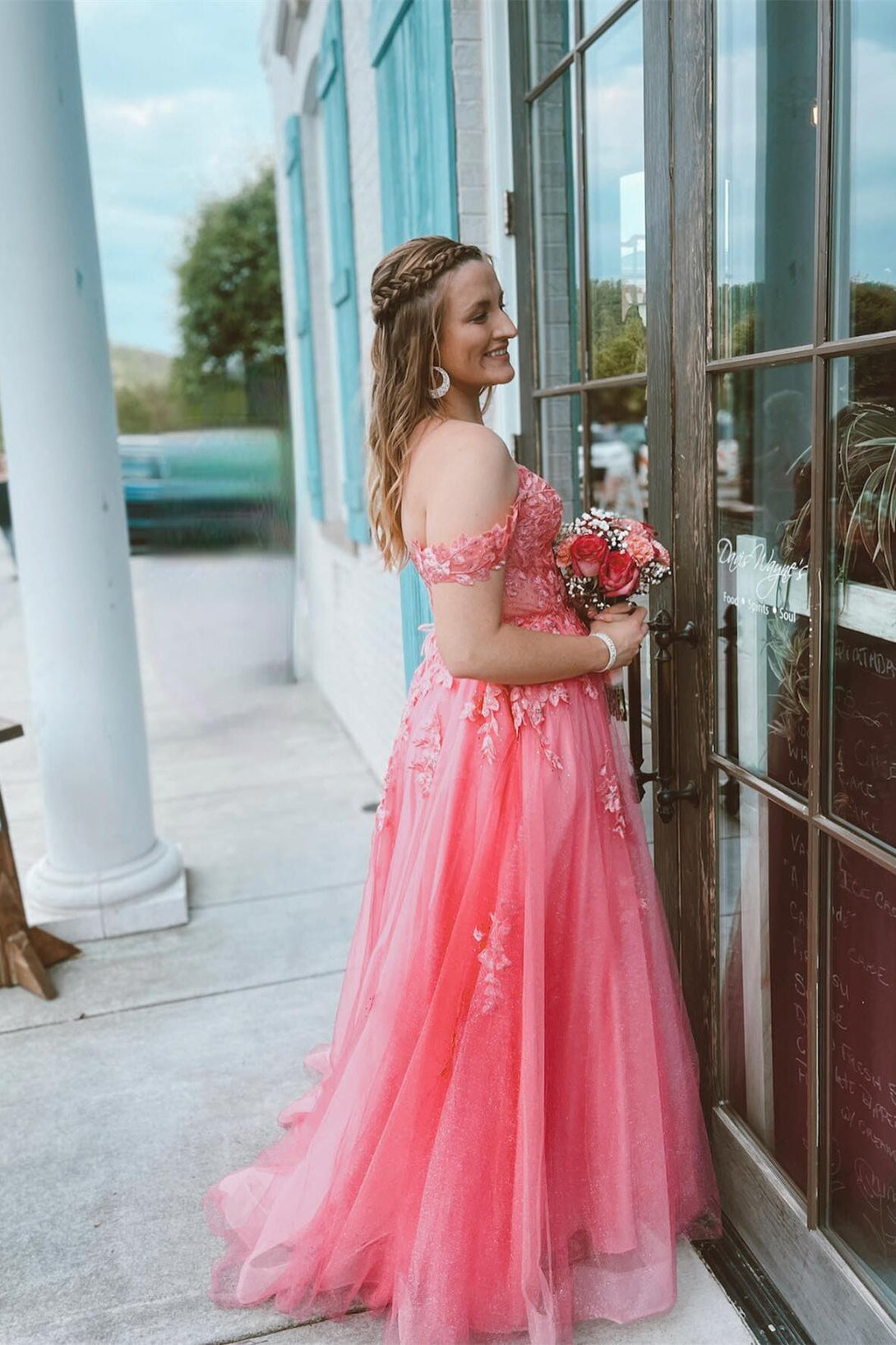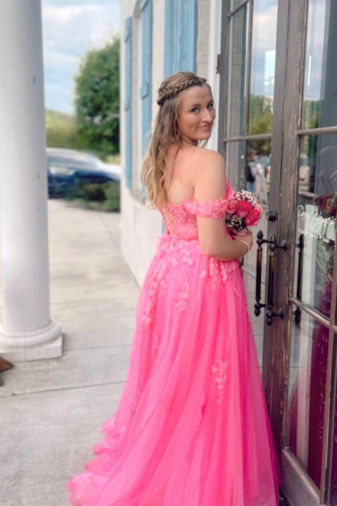 Off the Shoulder Hot Pink Appliques A-line Long Dress