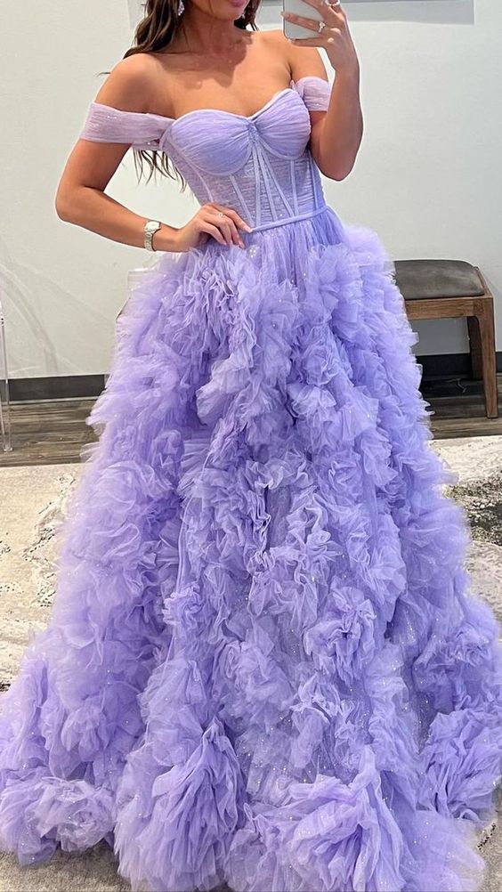 Off The Shoulder Lilac Tulle Prom Dresses Long