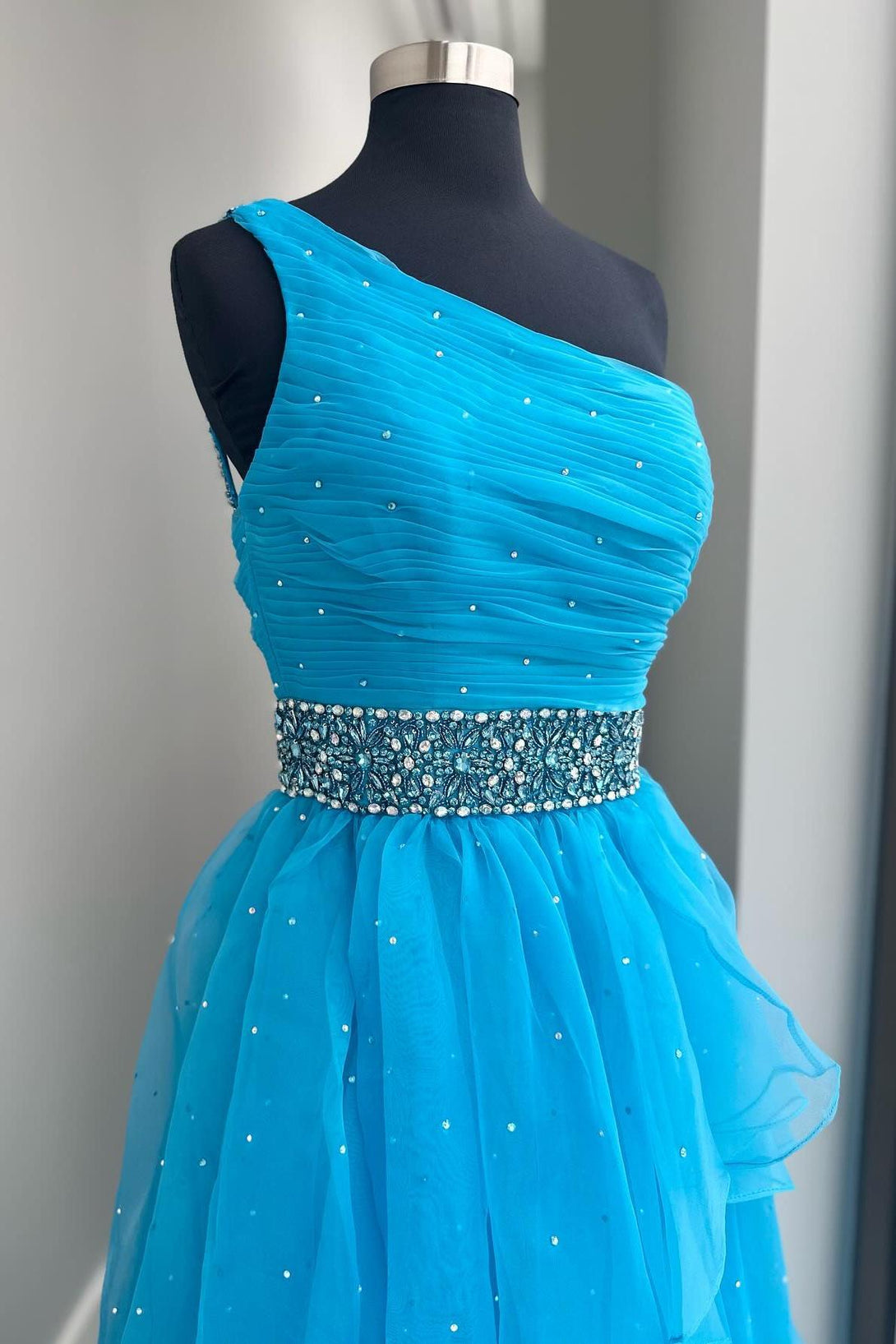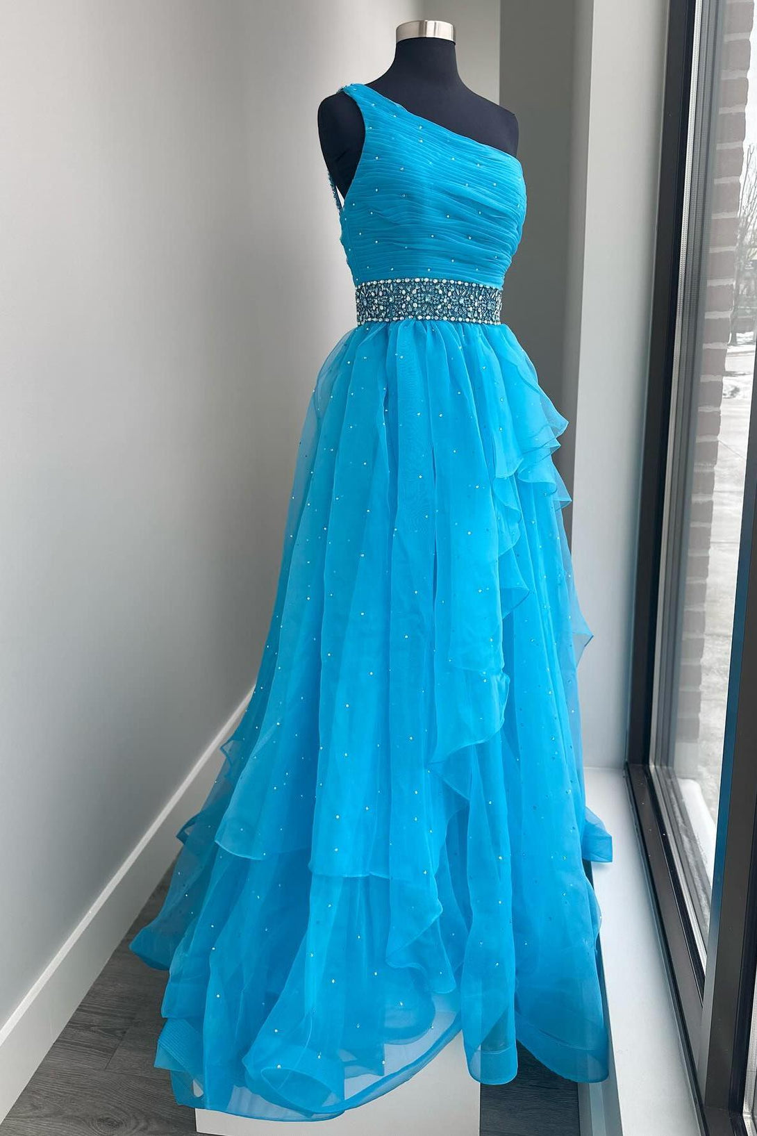 One Shoulder Blue Tulle Long Formal Dress with Beads