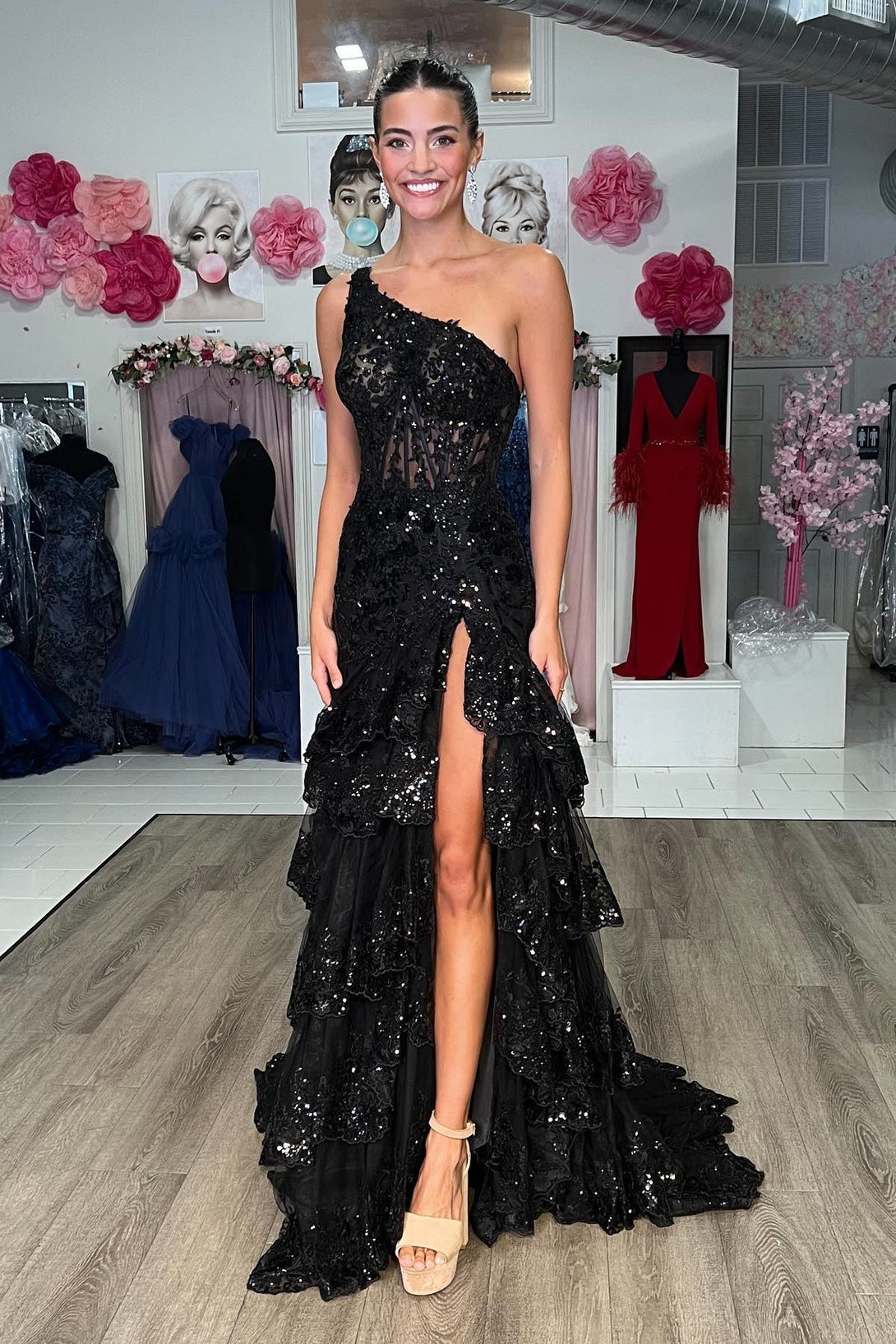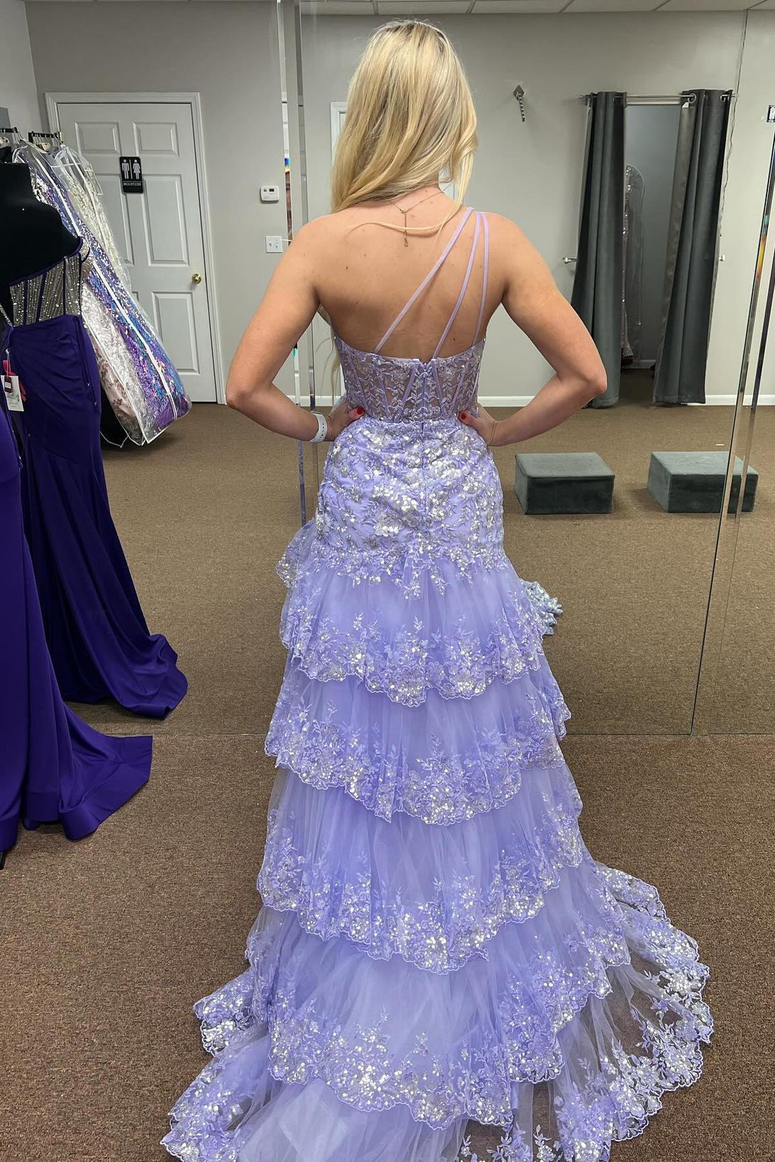 One Shoulder Blush Pink Tiered Ruffle Long Formal Dress