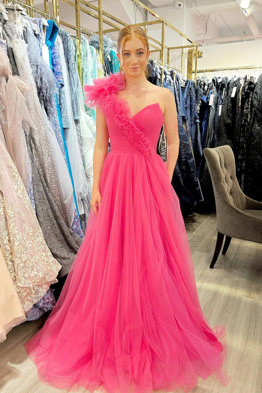 One Shoulder Hot Pink Pleated Long Formal Dress