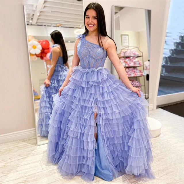 One Shoulder Lace Ruffles Tulle Prom Dresses