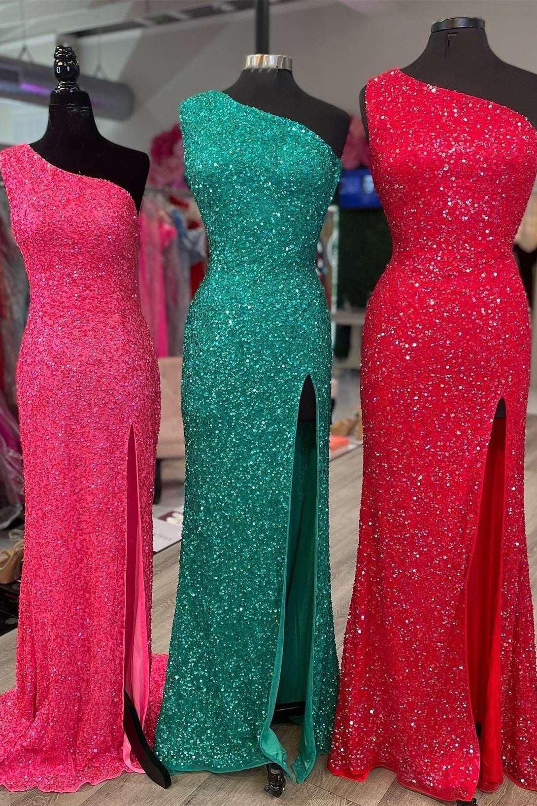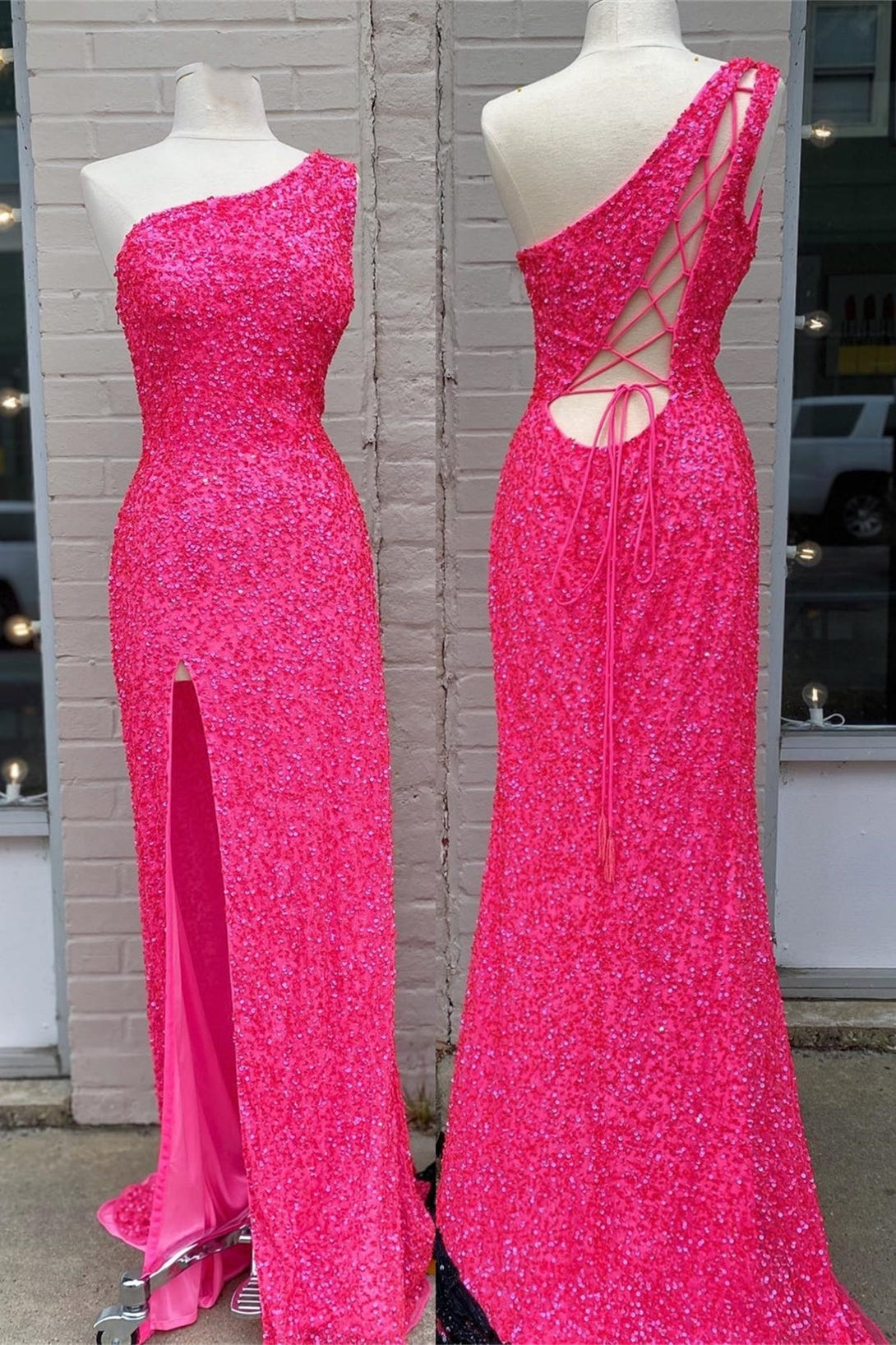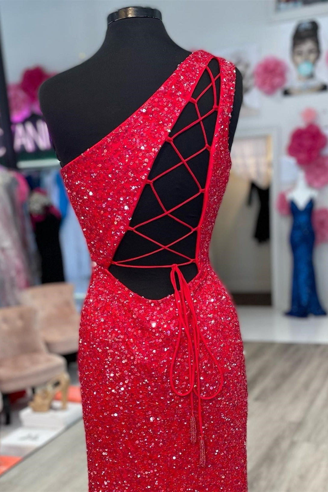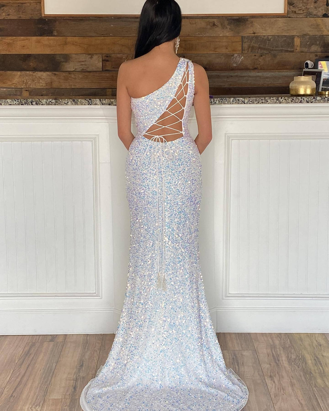 One Shoulder Sequin Mermaid Long Formal Dress with Lace Up Back
