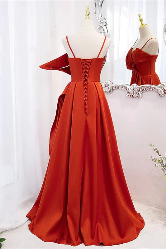 Orange Spaghetti Straps Knotted Satin A-line Long Dress Elegant Evening Dress