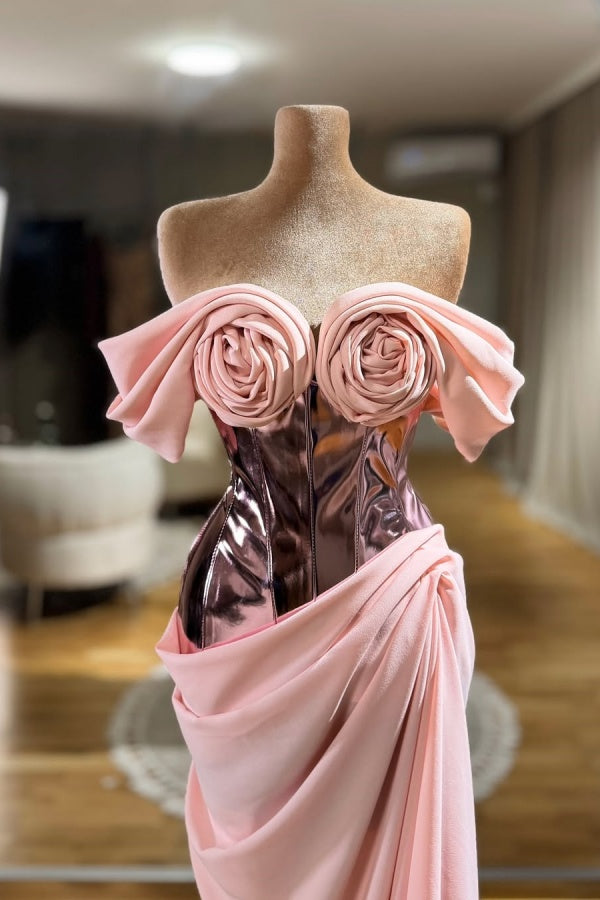 Pearl Pink Off-The-Shoulder Floral Neckline Pleated Prom Dress ssr0597