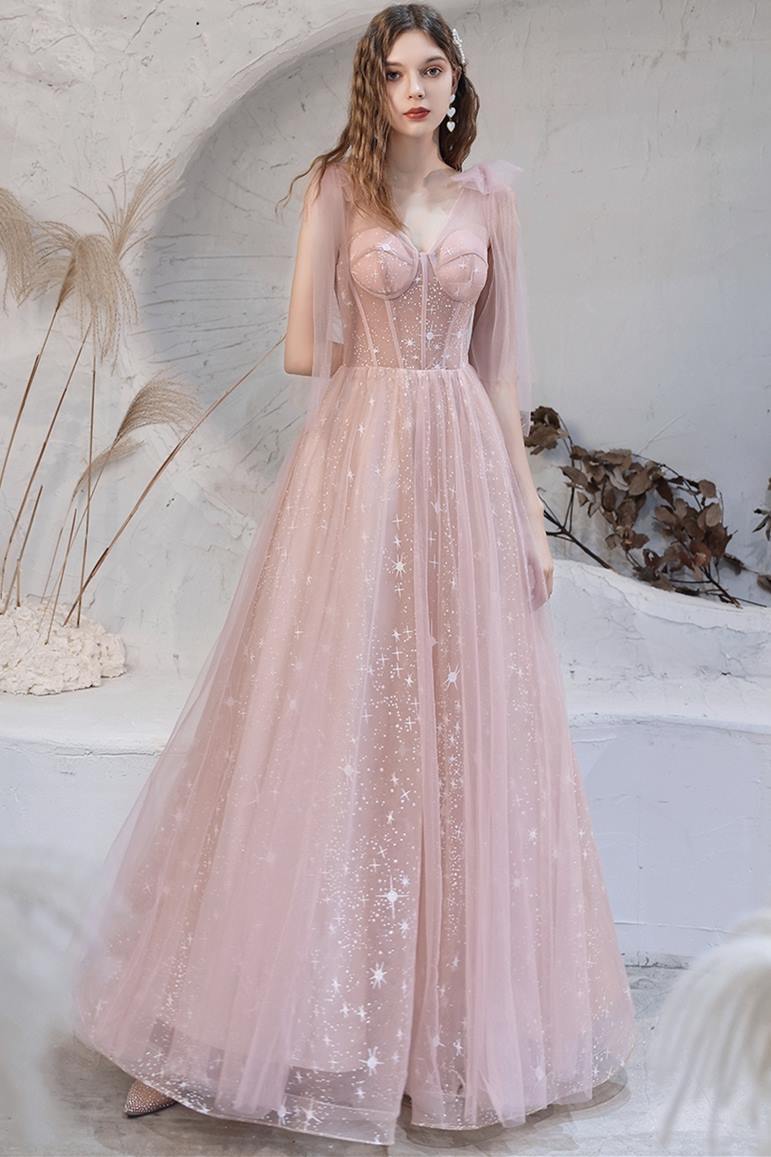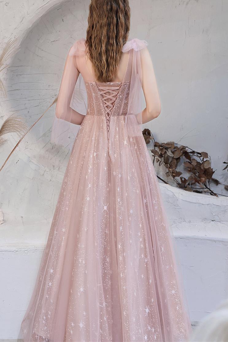 Pink A-line Tulle Long Prom Dress with Lace Up Back