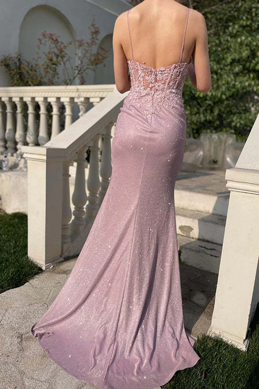 Pink Mermaid Corset Lace Appliques Spaghetti Straps Long Prom Dress Elegant Evening Dress