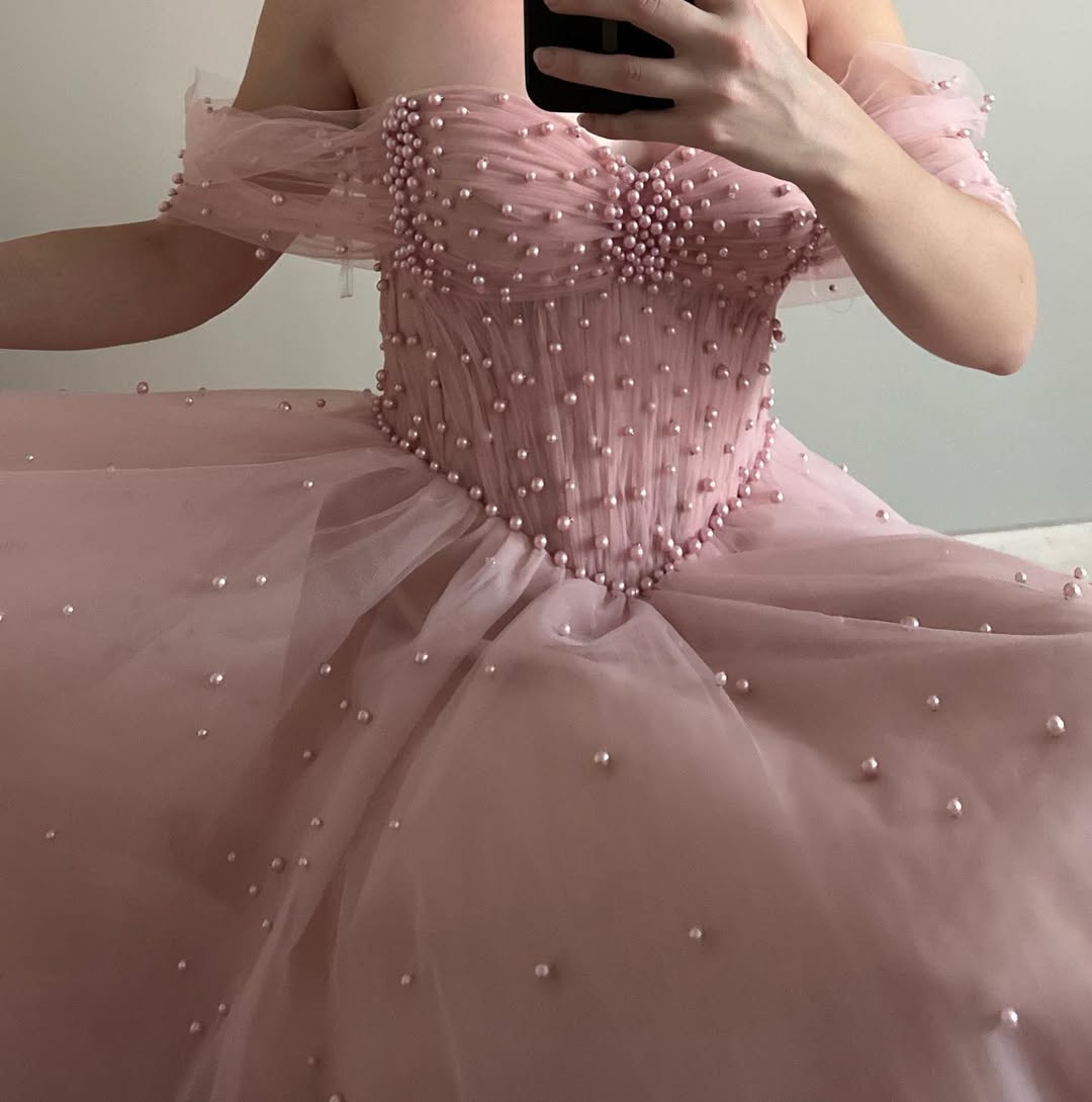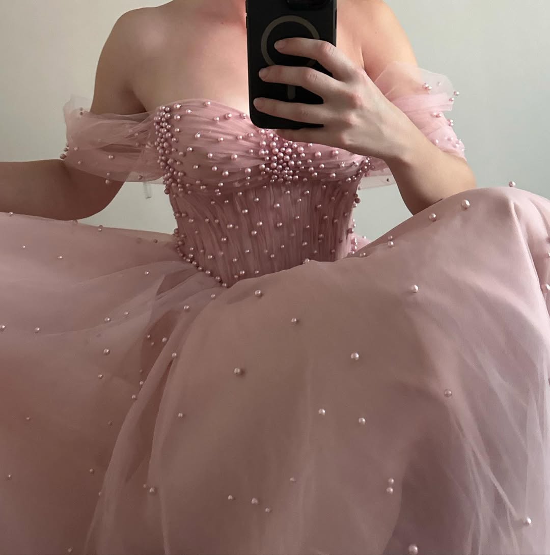 Pink Pearls Beaded Off-The-Shoulder Mesh Sweetheart Prom Dress ssr0328