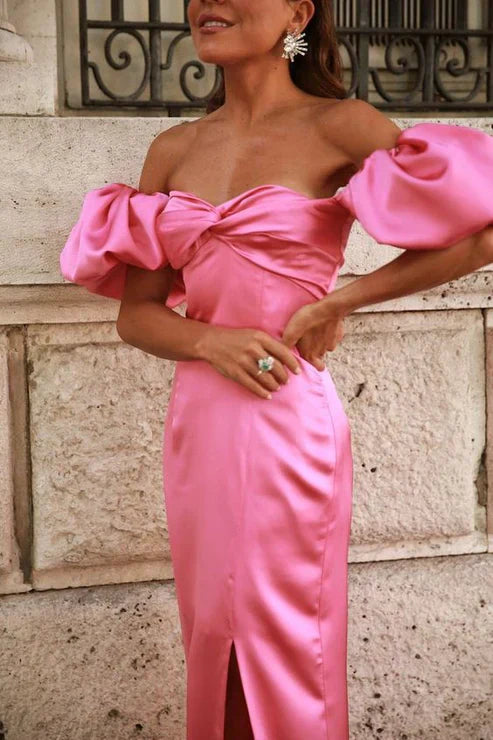 Pink Puff Sleeves Slit Prom Dress Sweet Off Shoulder Charming Evening Party Dress