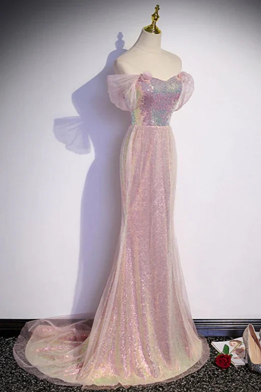 Pink Sparkly Mermaid Long Prom Dress Off Shoulder Floor Length Evening Dress