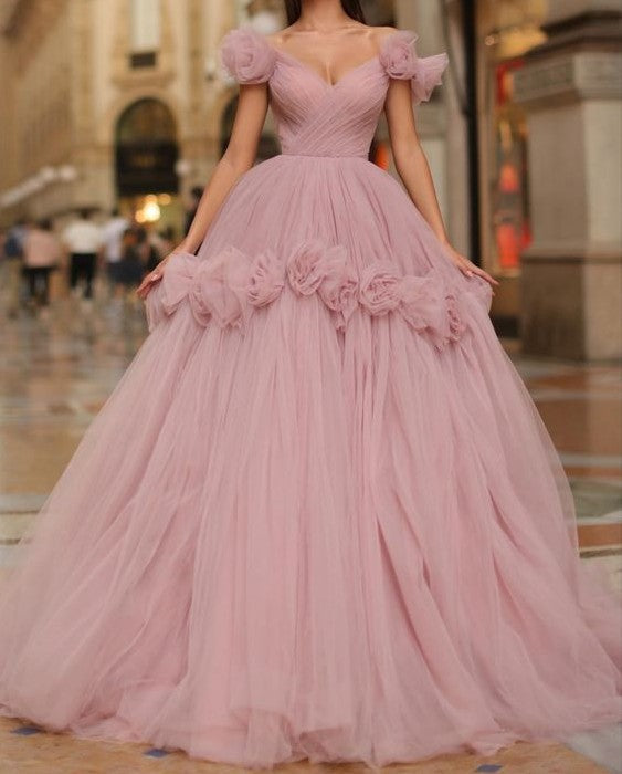 Pink Tulle A-Line Off The Shoulder Party Dress, Long Prom Dresses, Floral Prom Dresses