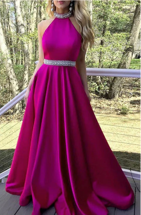 Popular Satin Jewel Neckline Backless Sweep Train A-line Prom Dresses With Rhinestones Evening Dresses