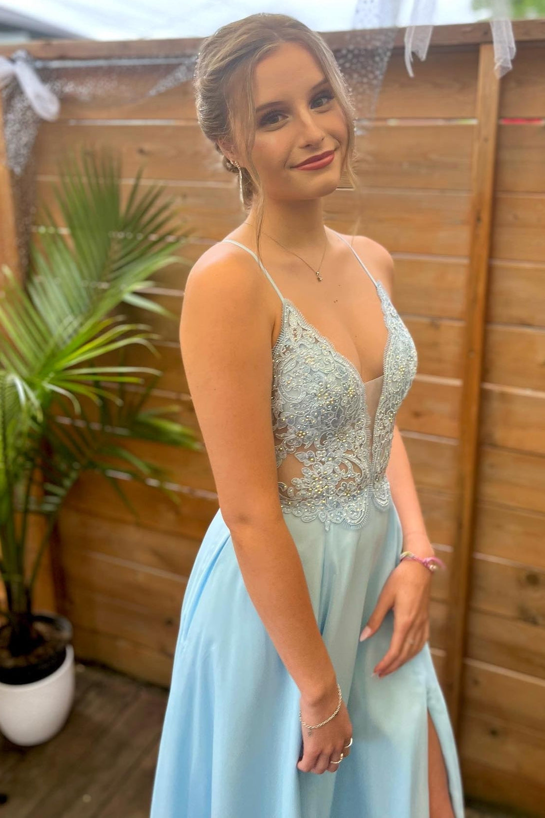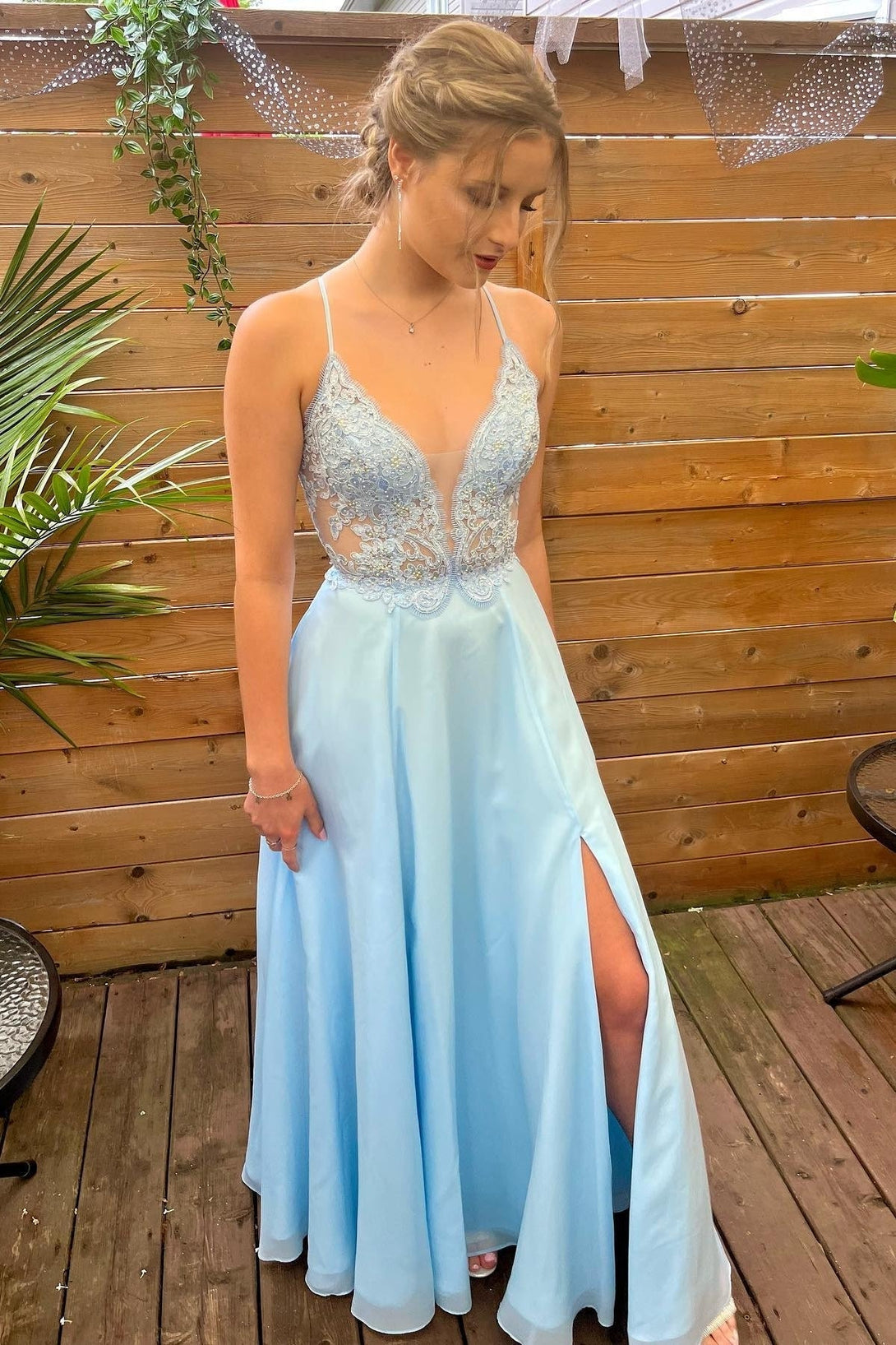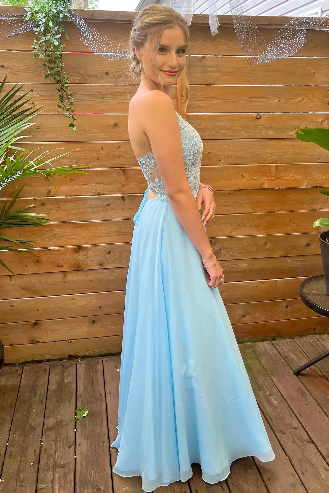 Princess Blue A-line Lace and Chiffon Long Prom Dress