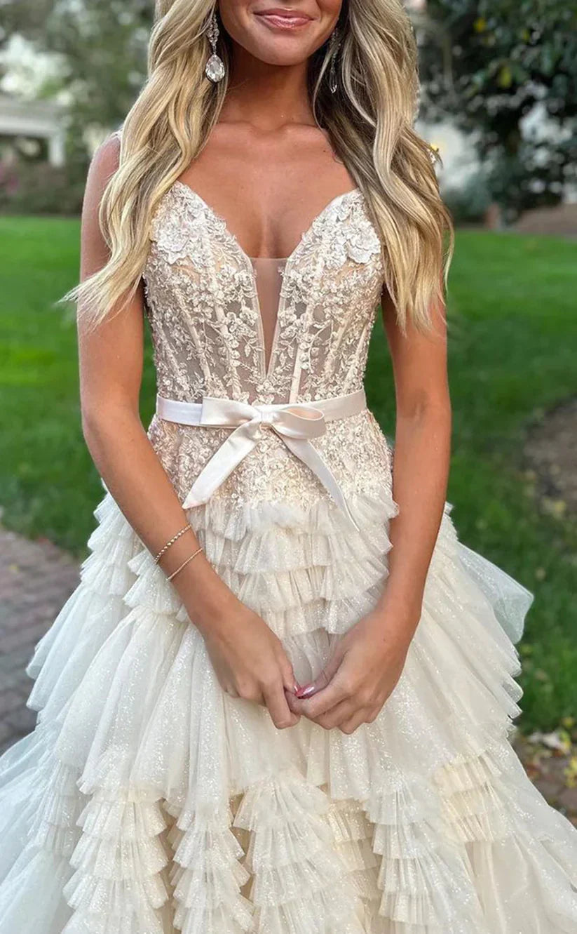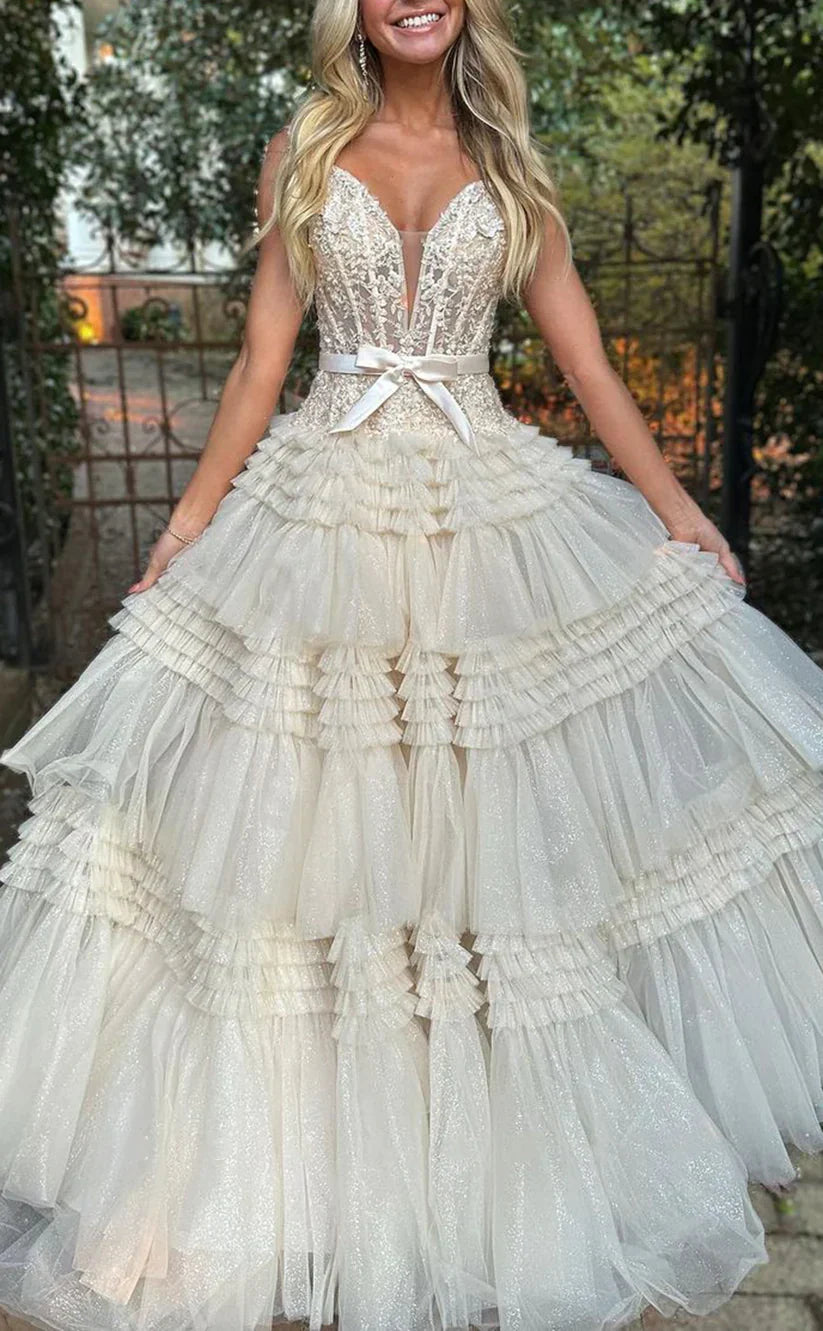 Princess V-Neck Lace Ruffle Tulle Prom Dresses, Long Celebrity Dress