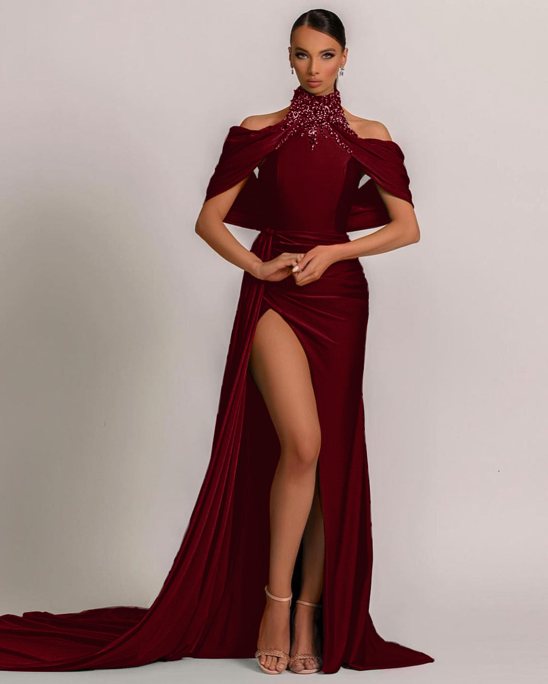 Prom Dress Sage Green With Pleated Halter Split Rhinstone ED0608