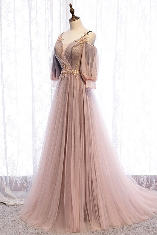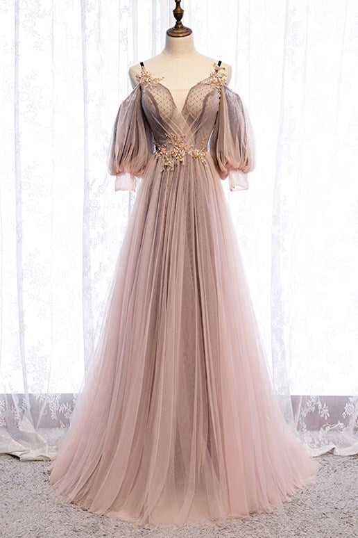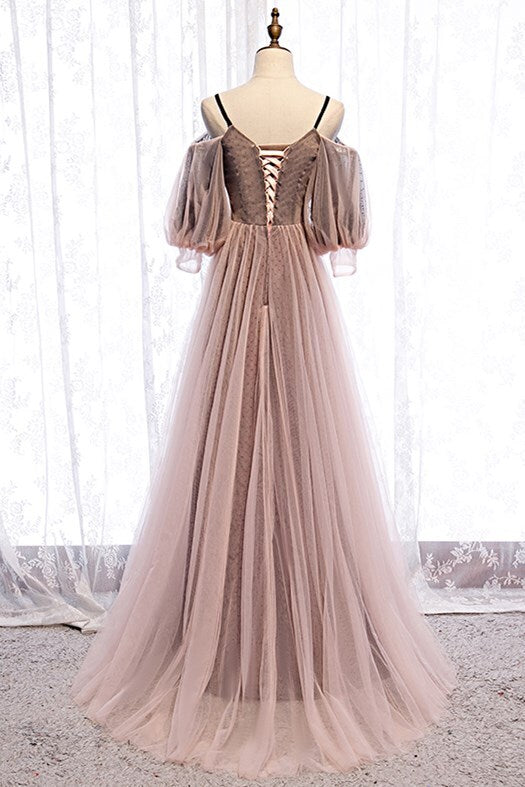 Puffy Sleeves Brown A-line Tulle Long Prom Dress